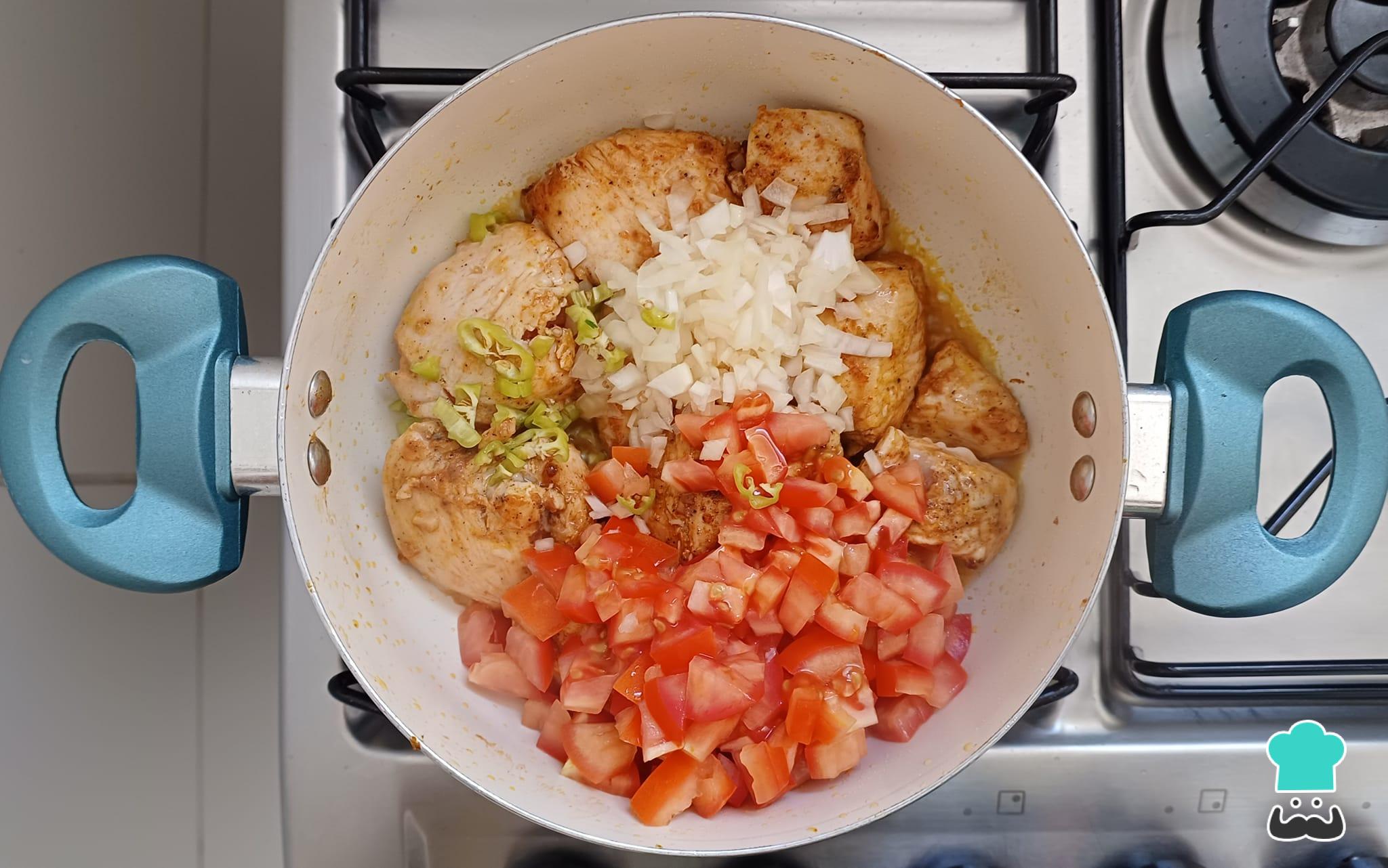 Adicione em seguida a cebola, o tomate e a pimenta-de-cheiro picados, refogando mais alguns minutos, mexendo de vez em quando.
