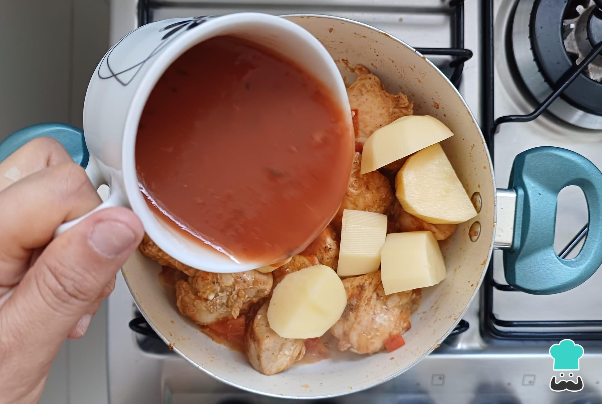 Adicione as batatas, o molho de tomate e a água morna.