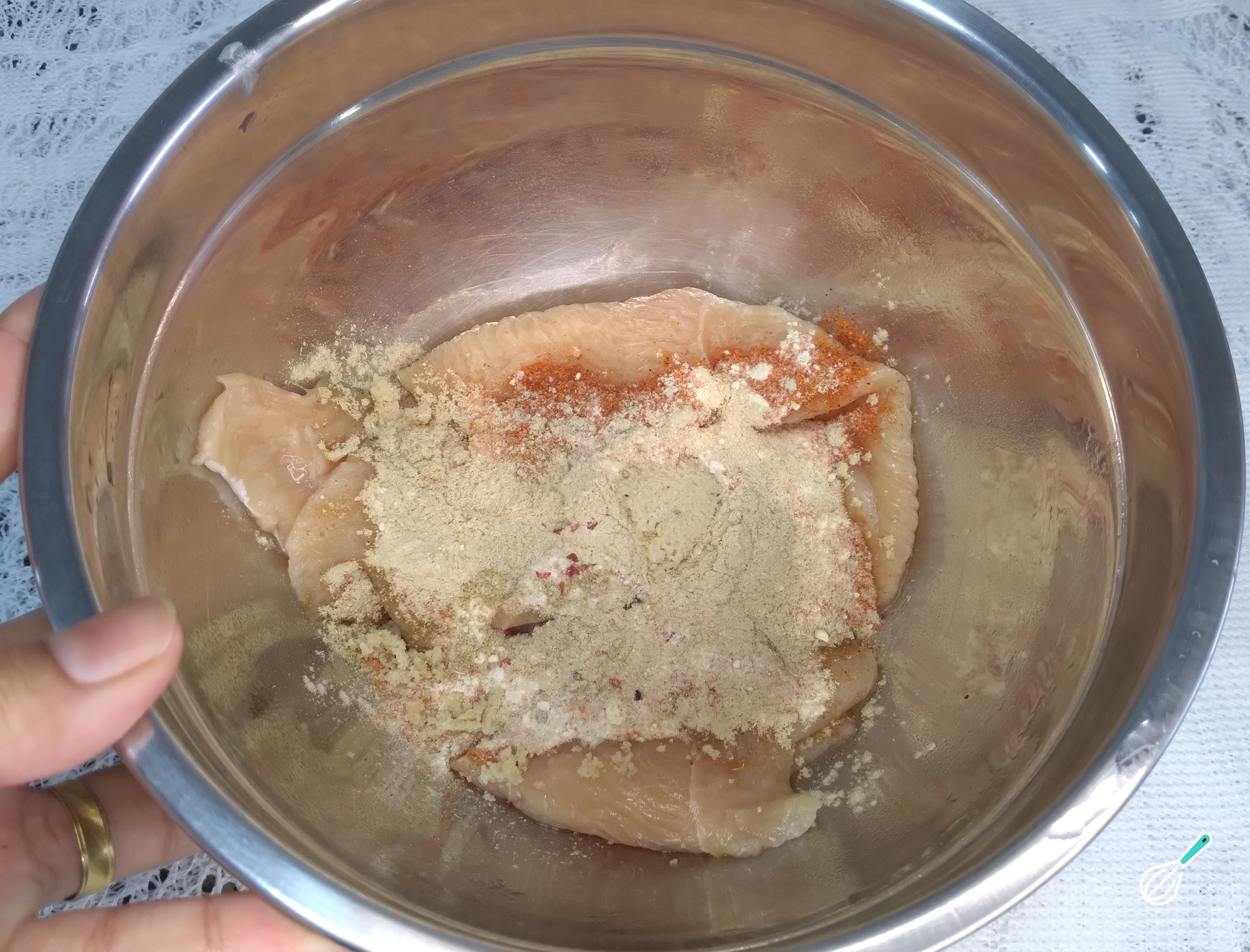 Em um bowl, coloque o peito de frango fatiado, acrescente os temperos, sal e pimenta.