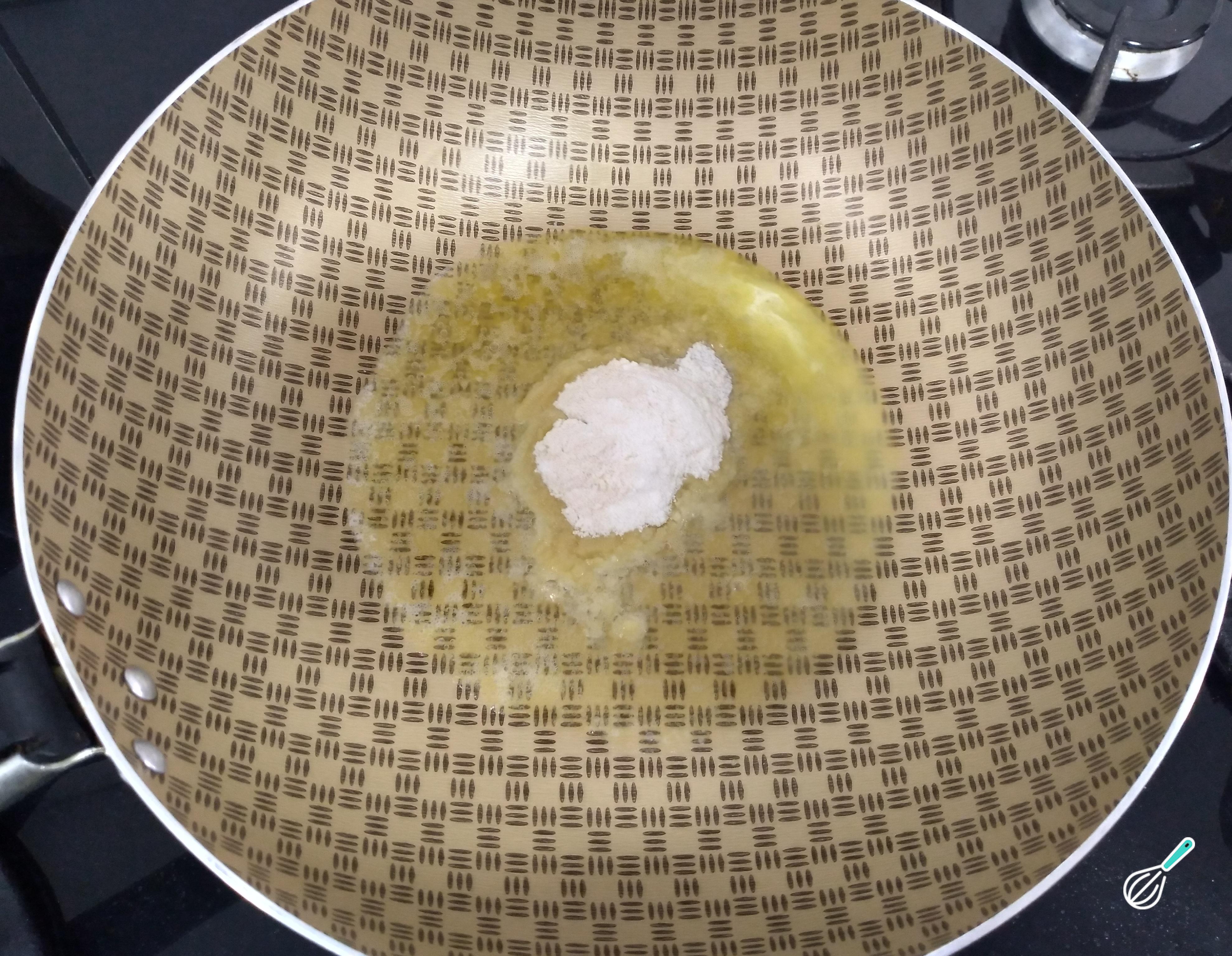 Comece colocando a margarina ou manteiga. Acrescente também a farinha de arroz.