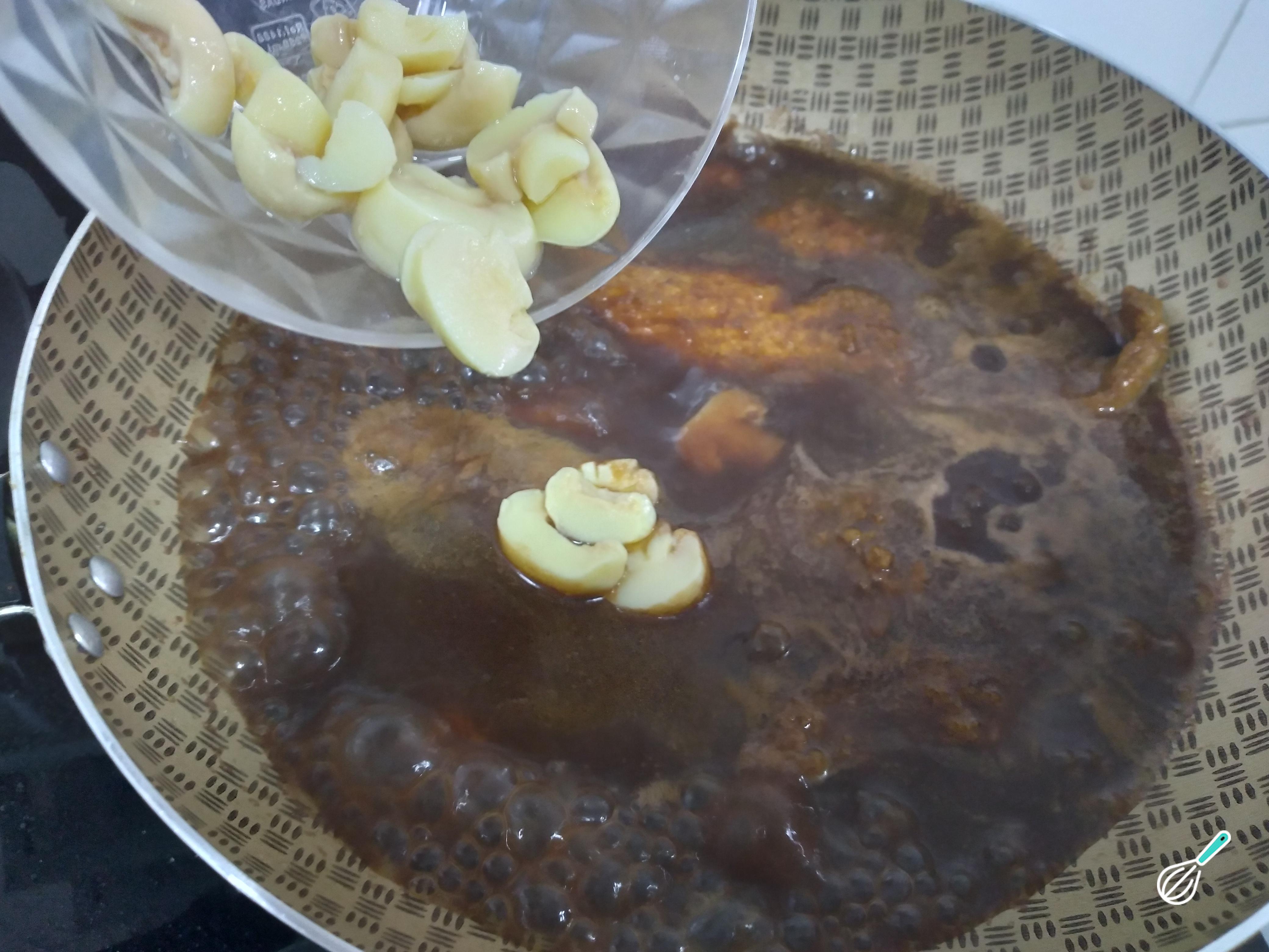 Feito isso, acrescente o vinho tinto,o molho inglês, a mostarda, sal, pimenta e 1 xícara de água.