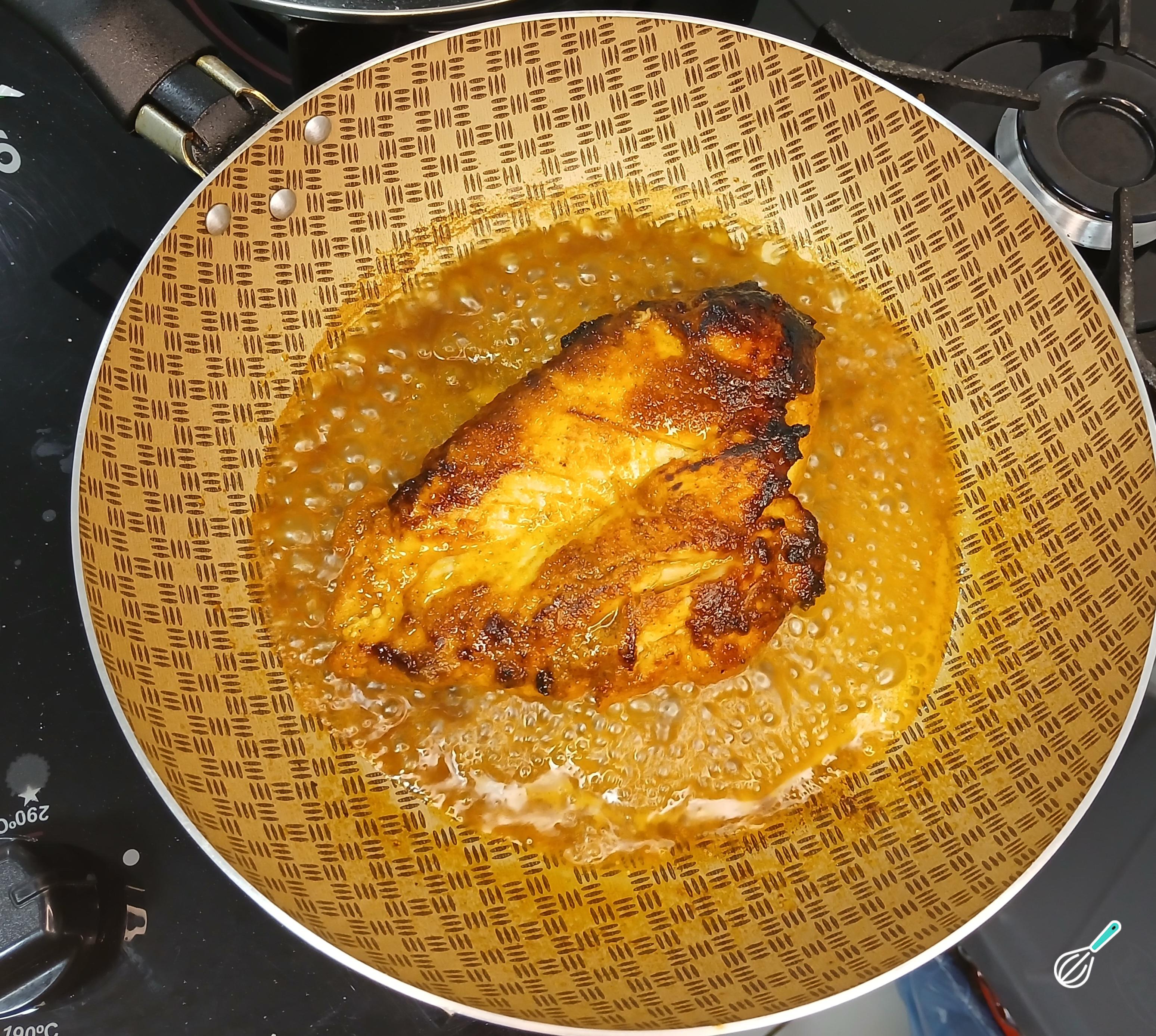 Depois de dourar o filé de frango, acrescente meio copo de água. Tampe a panela e deixe que o frango cozinhe em fogo de médio para baixo.