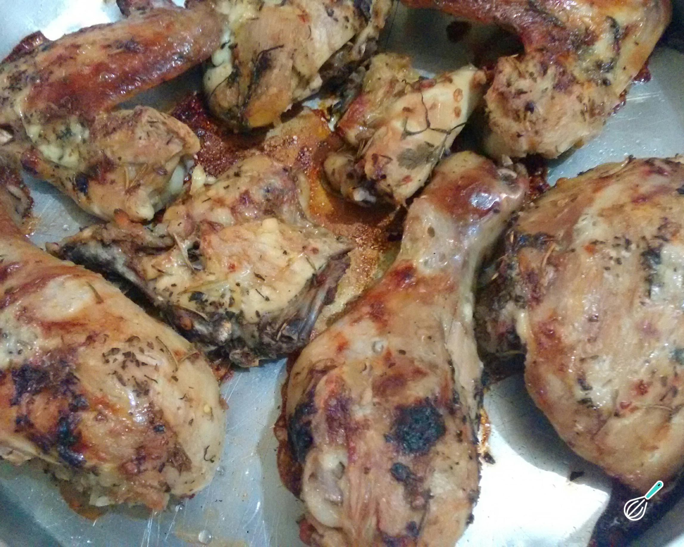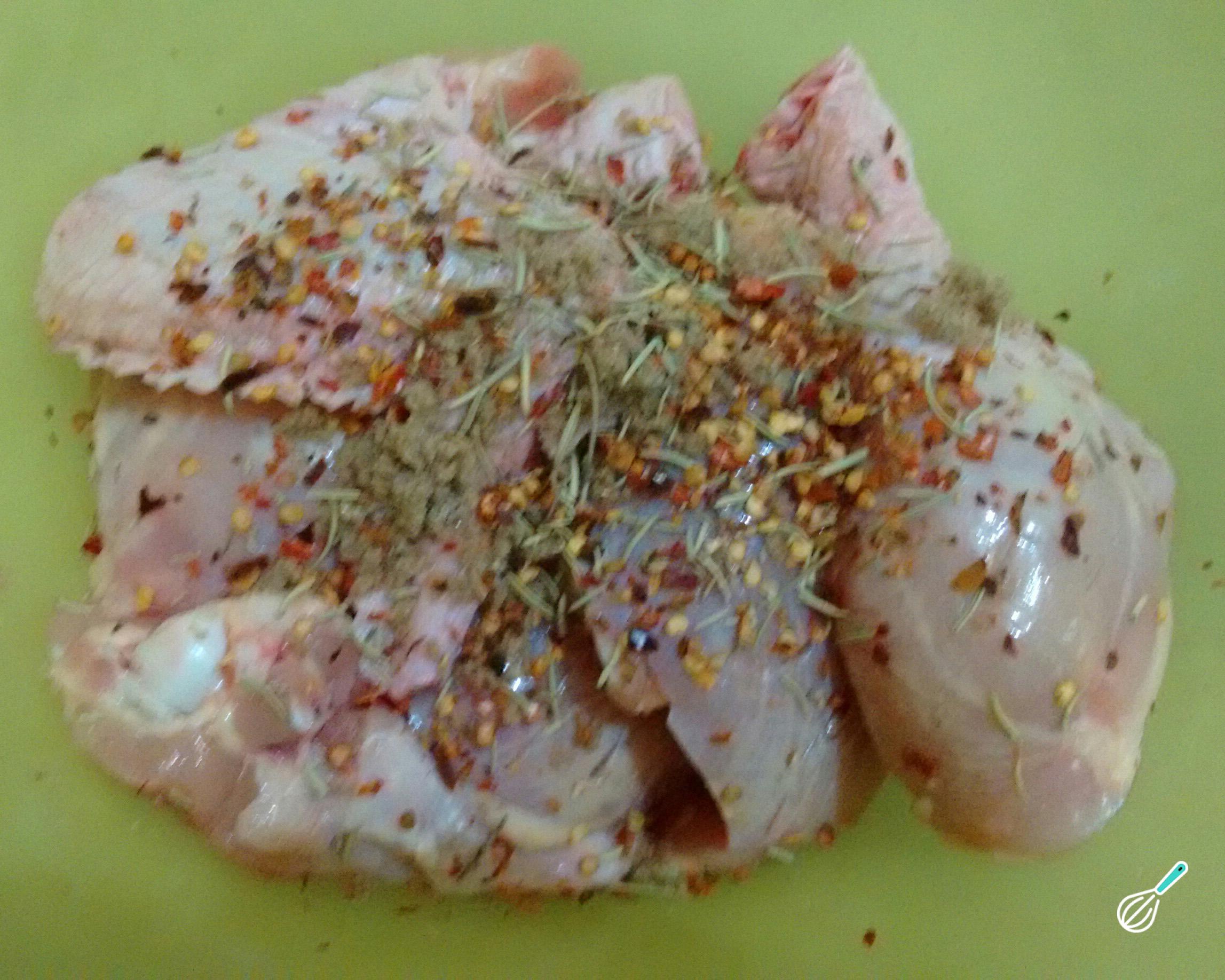 Limpe o frango tirando a pele e coloque os temperos: os alhos, o suco dos limões, a mostarda, o alecrim, a noz moscada, os oréganos, a pimenta e o sal. Deixe marinar por, no mínimo, 2 horas.