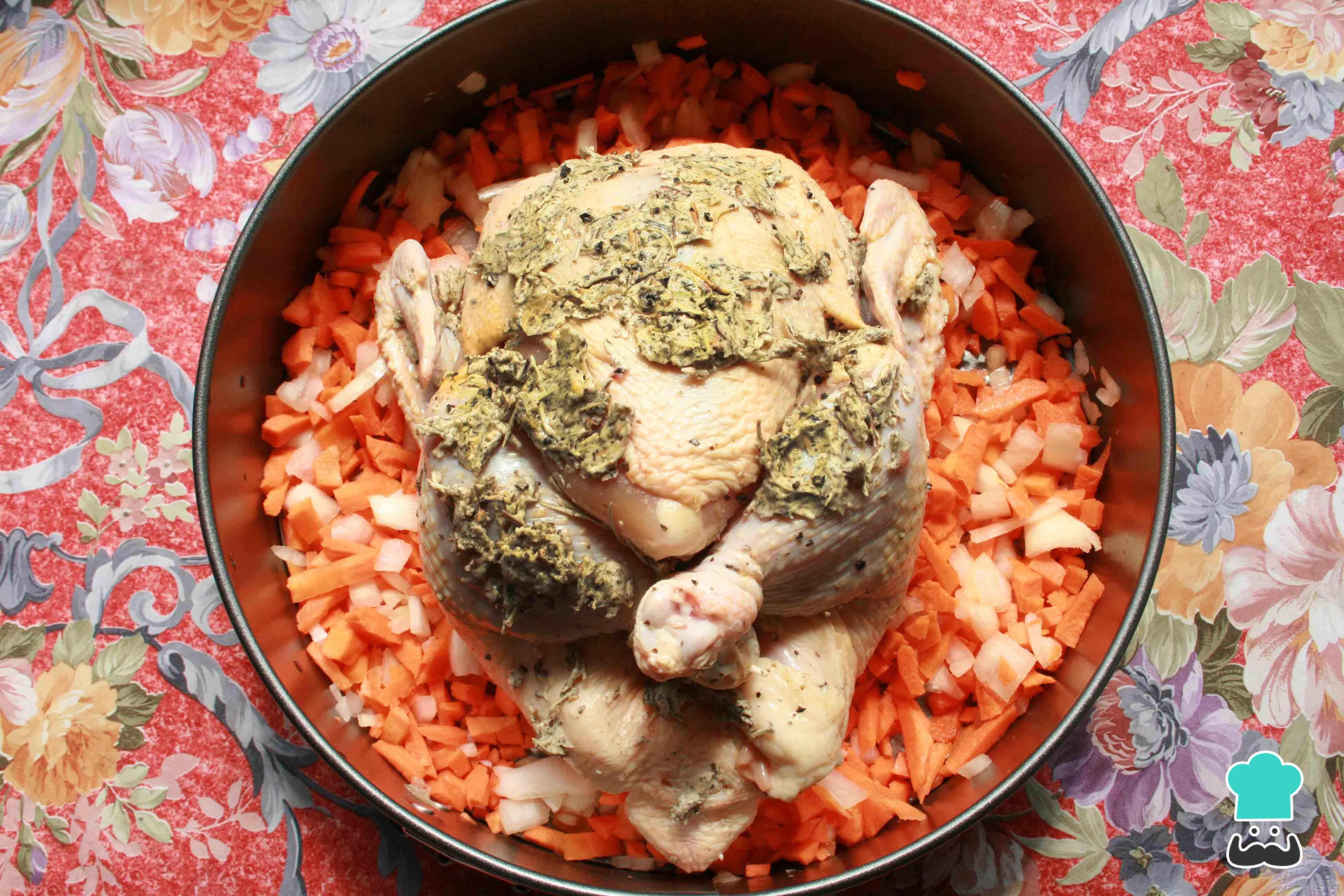 Unte uma assadeira e coloque nela a cebola e as cenouras picadas. Coloque o frango inteiro sobre esses legumes, cubra com papel alumínio e leve a assar no forno preaquecido a 200ºC por 45 minutos. Depois retire o papel e deixe o frango dourar por 10-15 minutos.