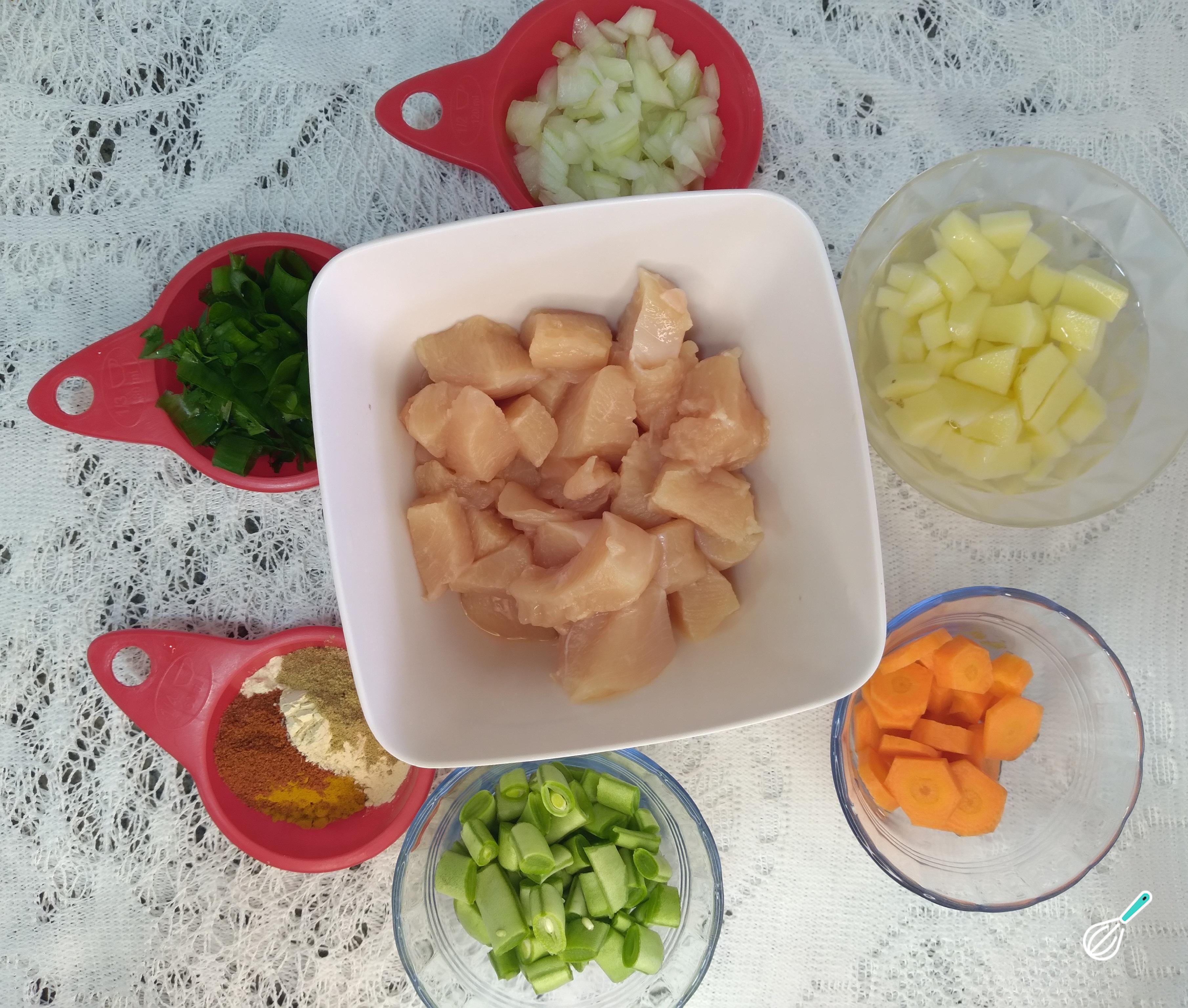Comece separando os ingredientes para o preparo da receita. Limpe e corte o peito de frango em cubos médios, corte a vagem em pedaços pequenos e a cebola branca em cubinhos. Corte a cebolinha e salsinha em pedaços pequenos. A cenoura corte em rodelas finas. Separe o açafrão em pó e os temperos de sua preferência.