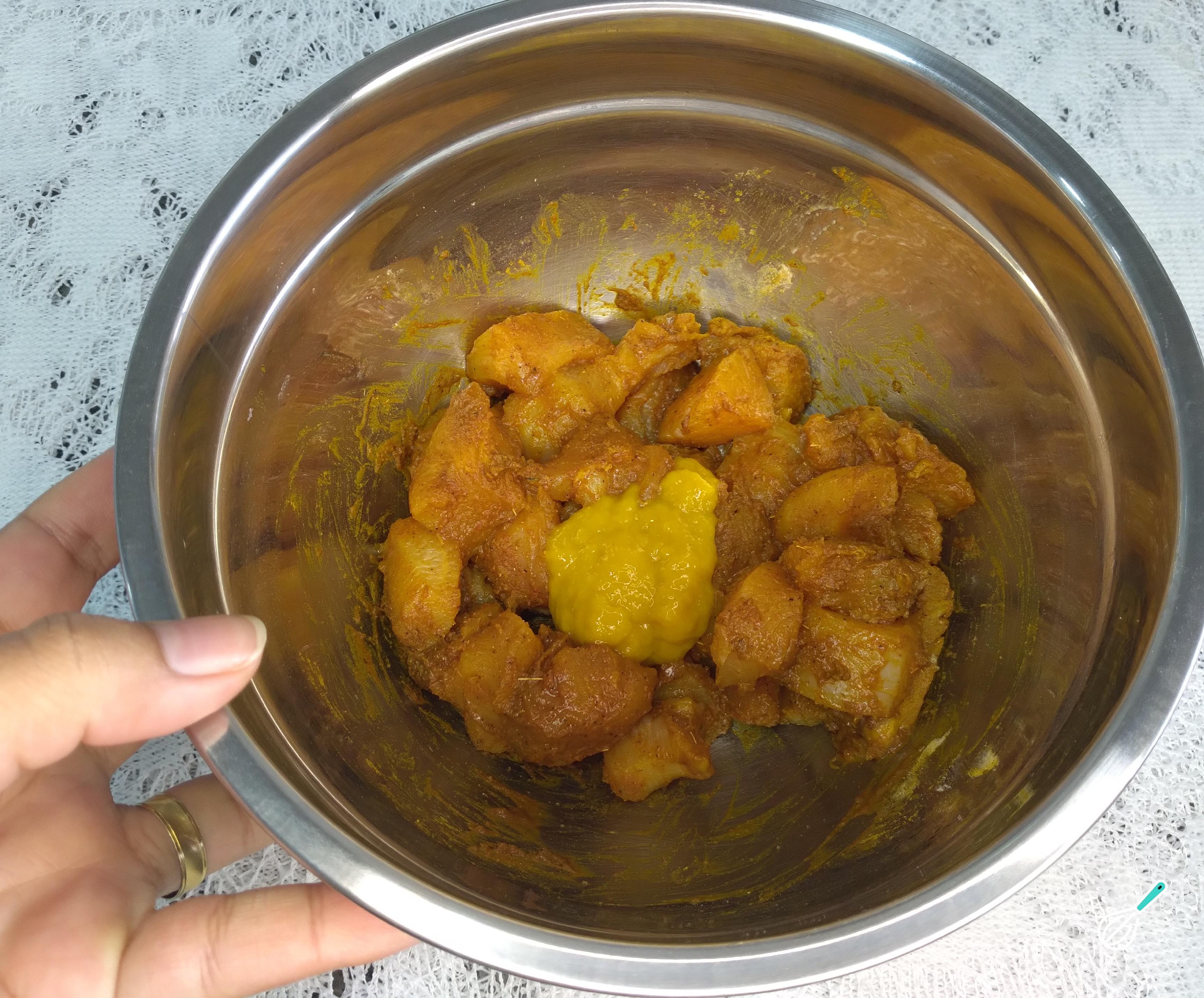 Em um bowl, coloque os pedaços cortados do filé de frango. Tempere com sal, açafrão em pó e os temperos de sua preferência. Misture tudo muito bem. Acrescente a mostarda amarela. Misture bem e deixe descansar por 20 minutos na geladeira. Esse tempo de pausa é importante para que o frango absorva bem os temperos.