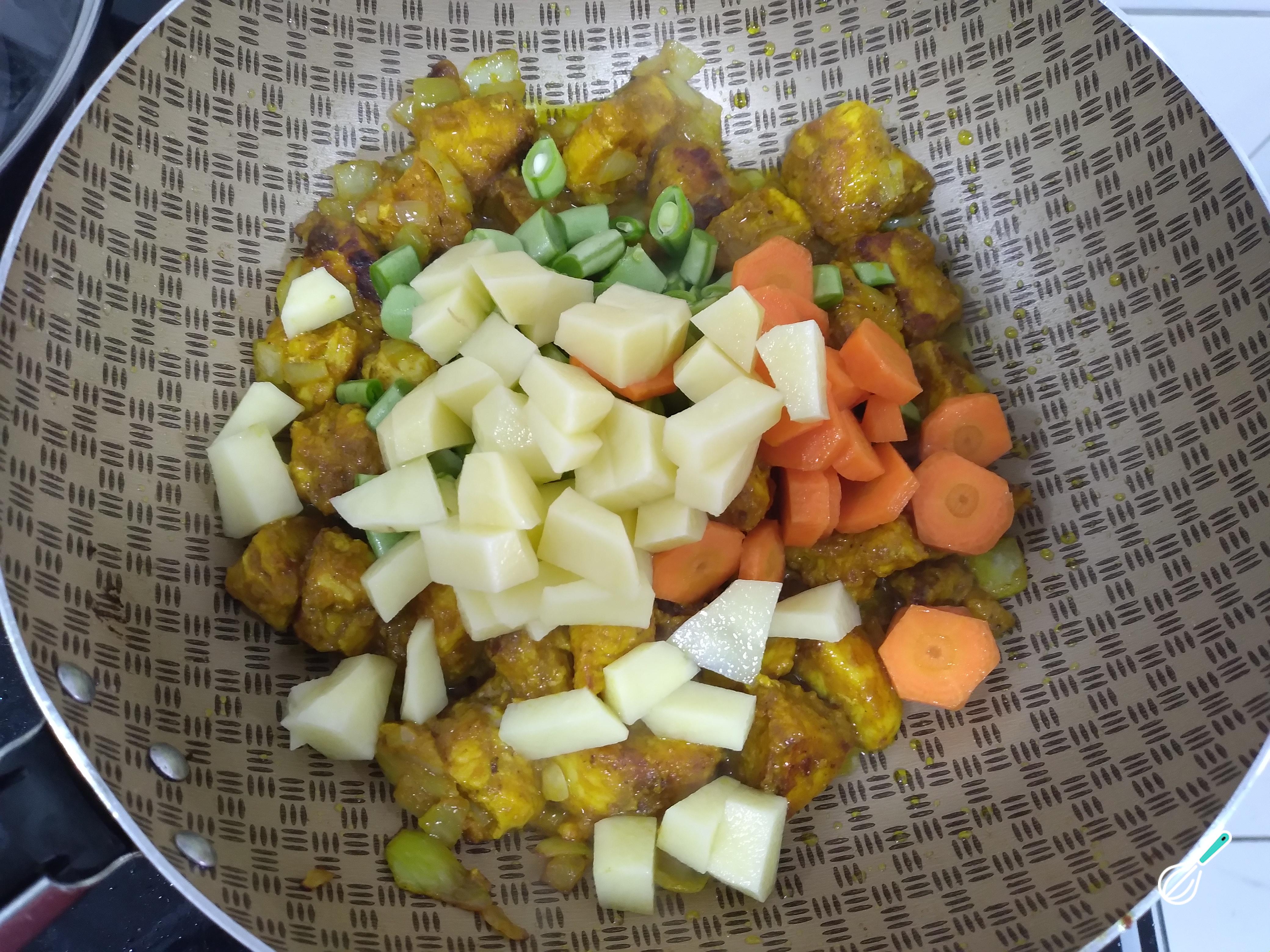 Depois disso, acrescente os legumes cortados e refogue bem. Reserve a cebolinha verde e salsinha. Mexa para que os temperos sejam absorvidos pelos legumes. Use uma colher de pau para misturar.
