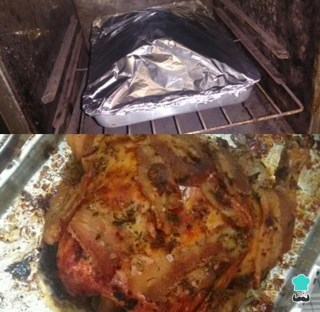 Após o tempo indicado faça uma cama com a cebola em uma assadeira, coloque o frango envolto em papel alumínio e leve ao forno preaquecido em temperatura média por 2 horas e meia. Retire o papel alumínio, reserve a cebola e volte com o frango ao forno, para dourar e deixar o bacon bem crocante.