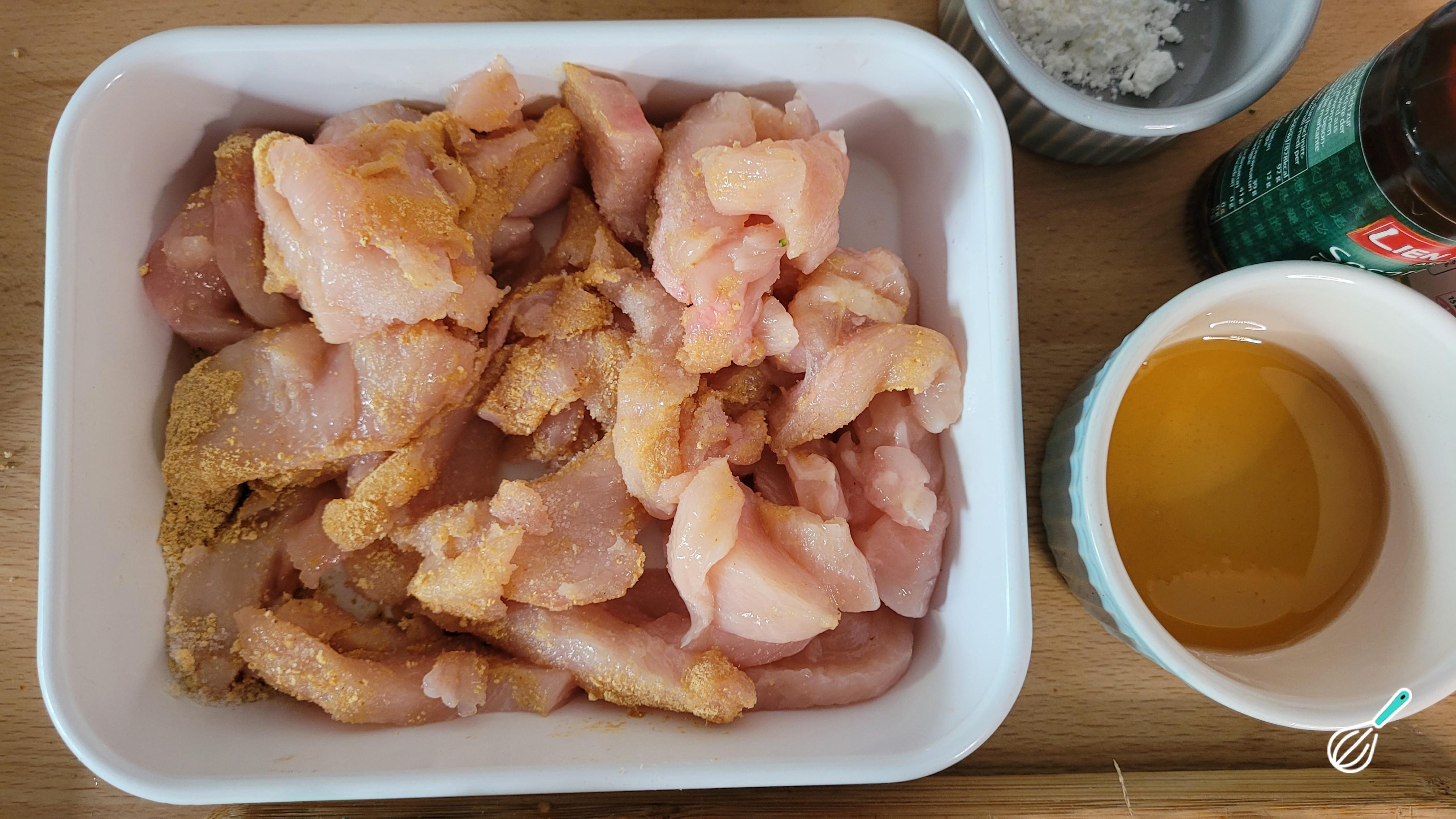 Leve para refogar em uma frigideira com óleo de gergelim até dourar. Não precisa deixar cozinhar totalmente, é apenas para dourar. O frango irá terminar de cozinhar com os vegetais.