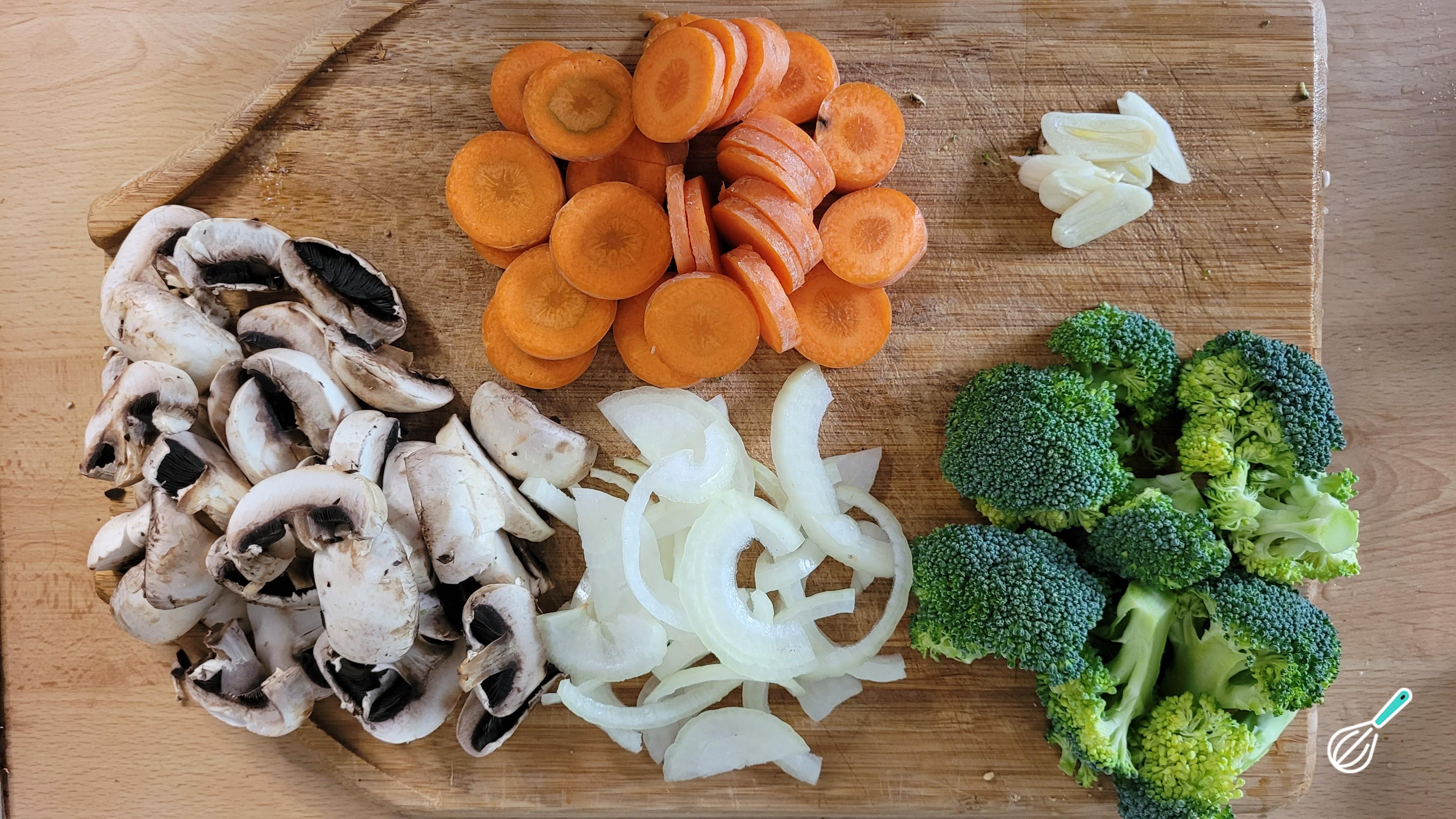 Enquanto isso, corte os vegetais. Pode cortar como preferir, aqui cortei o brócolis em floretes, a cebola em meias luas, o alho em fatias, a cenoura em rodelas e os cogumelos em fatias.
