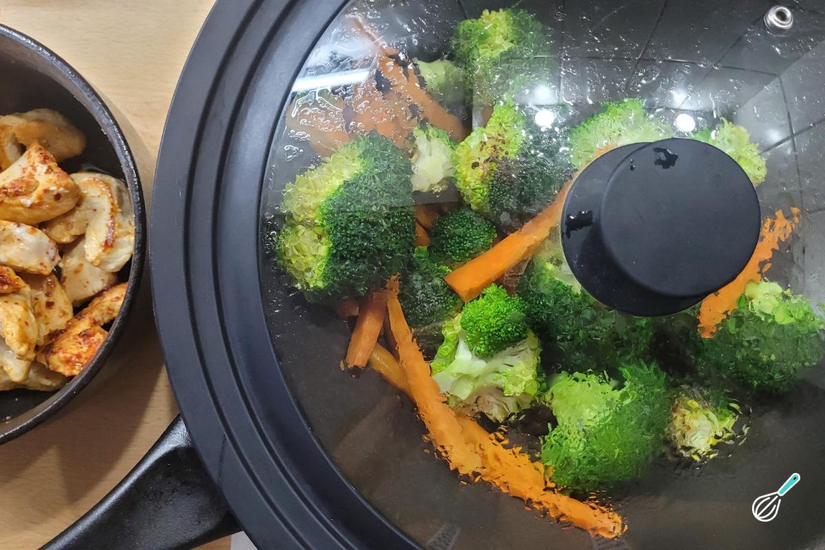 Quando os vegetais estiverem quase chegando no ponto que quiser, volte com o frango para a frigideira para que termine de cozinhar.