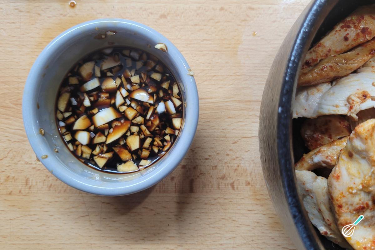 Enquanto isso, prepare o molho misturando o shoyu com o dente de alho picado.