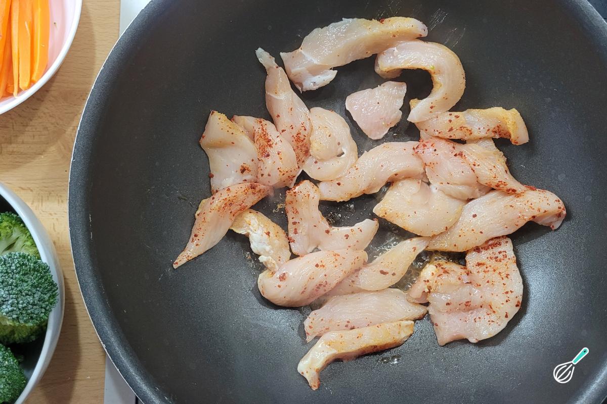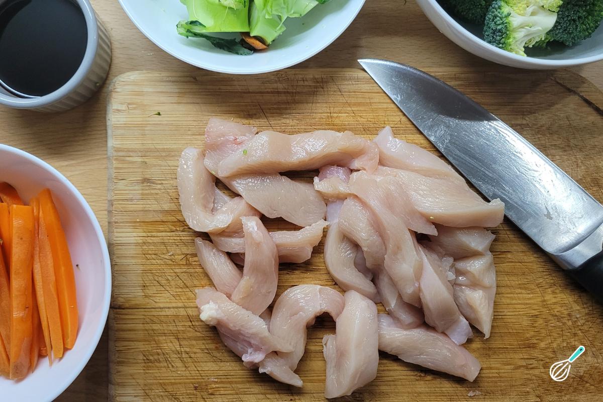 Reserve os vegetais cortados e corte o peito de frango em tiras.