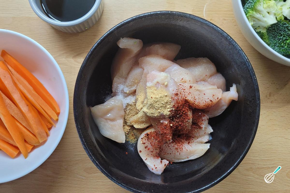 Transfira o frango para uma tigela e tempere com sal, pimenta e gengibre (coloquei pouco sal porque o molho à base de shoyu já é salgado) e misture bem.