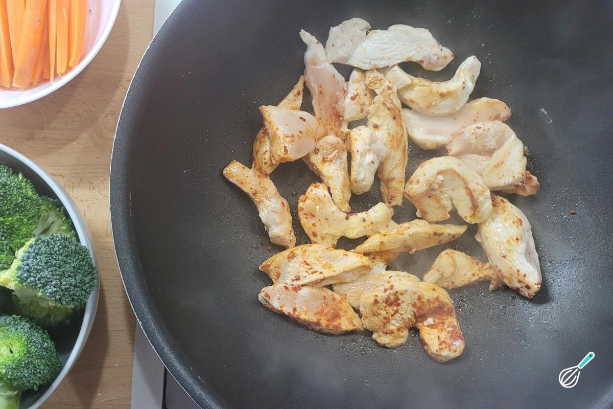 Deixe dourar bem de todos os lados, mas lembre que o frango não precisa ficar totalmente cozido, pois ele terminará de cozinhar depois. Isso apenas cria uma base maior de sabor para os vegetais, que vão ser refogados na mesma frigideira.