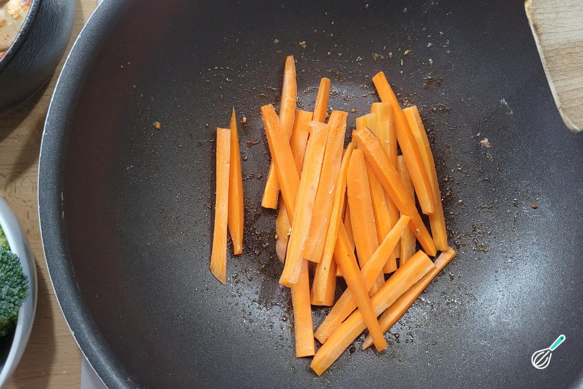 Reserve o frango dourado e adicione a cenoura (se precisar, coloque mais um pouquinho de óleo de gergelim - ou o óleo que estiver usando).