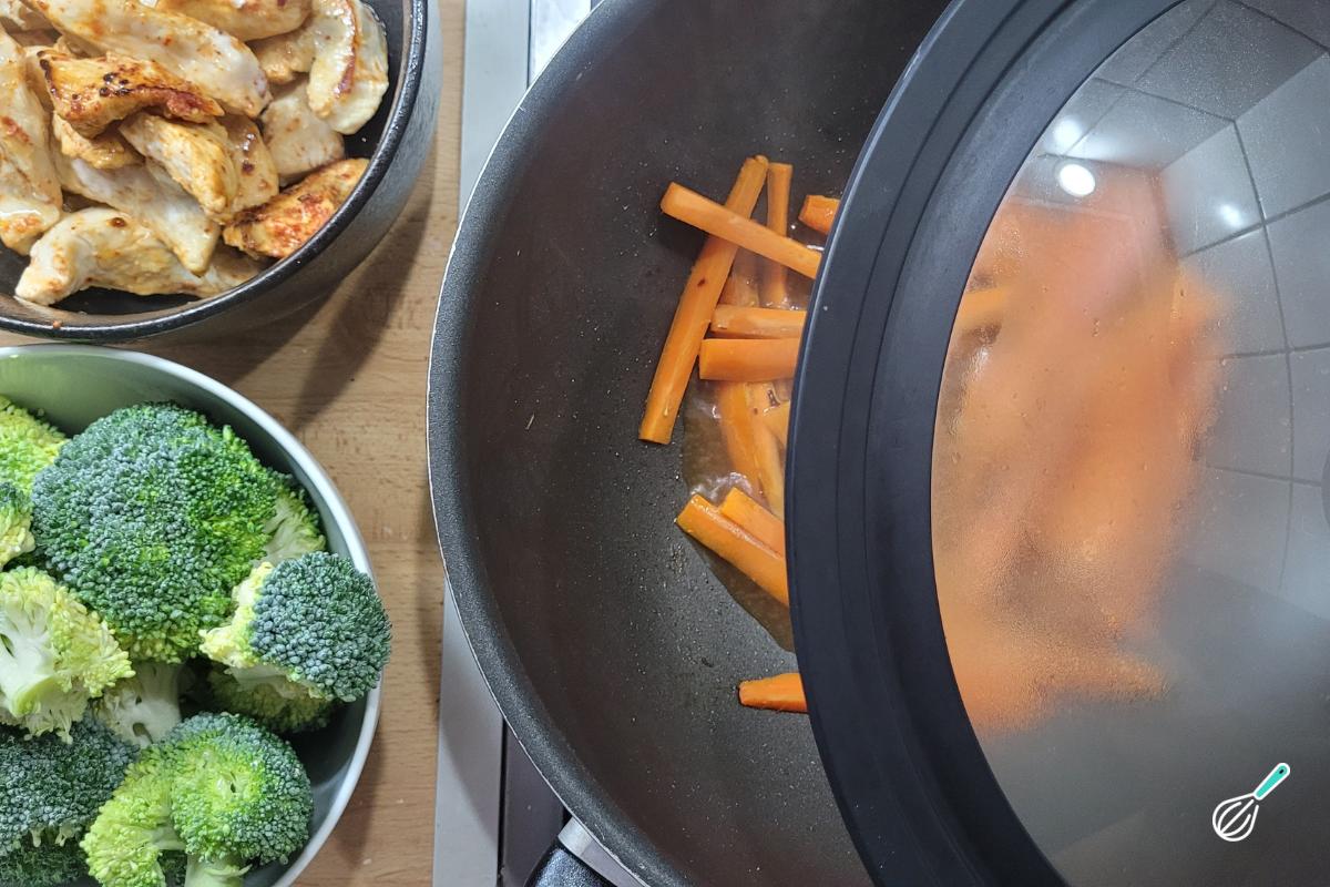 Depois que tiver dado uma dourada, coloque um pouquinho de água (cerca de 2 colheres de sopa) e tampe. Essa técnica cria um vapor que faz com que os vegetais cozinhem mais rápido, mas sem perder a textura. Assim também é mais fácil controlar a textura desejada de acordo com a sua preferência.