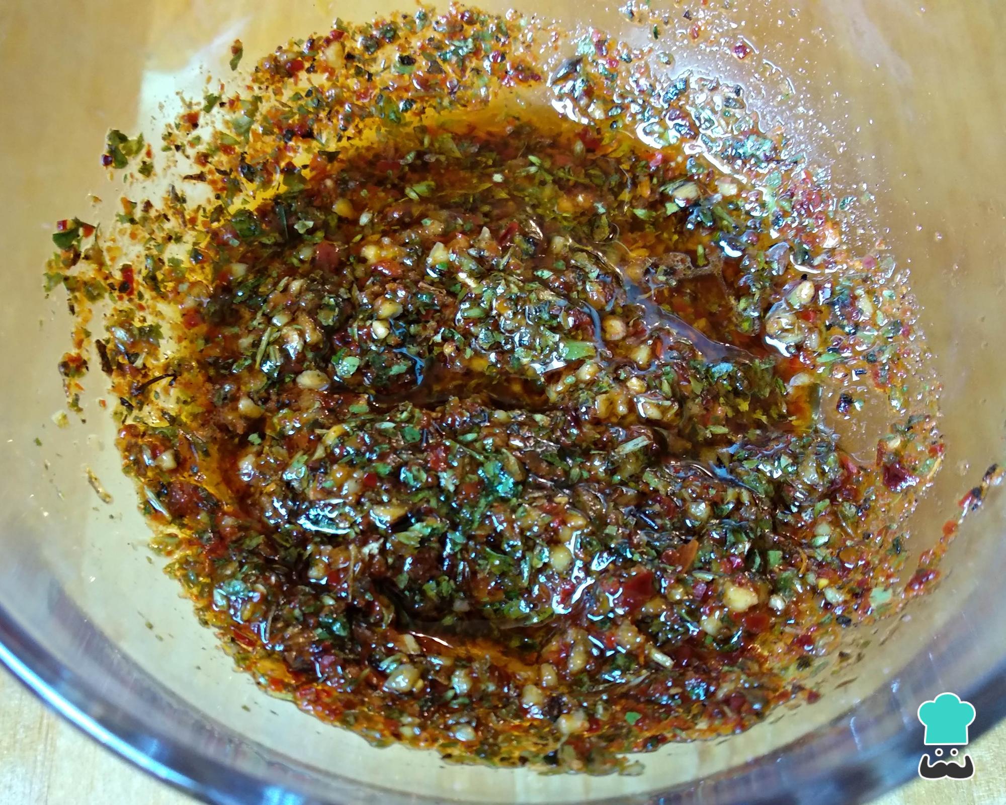 Como temperar frango com chimichurri seco? Primeiramente coloque o chimichurri numa tigela e adicione a água e o azeite. Misture e deixe por 5 minutos, para hidratar o chimichurri e ativar os sabores.