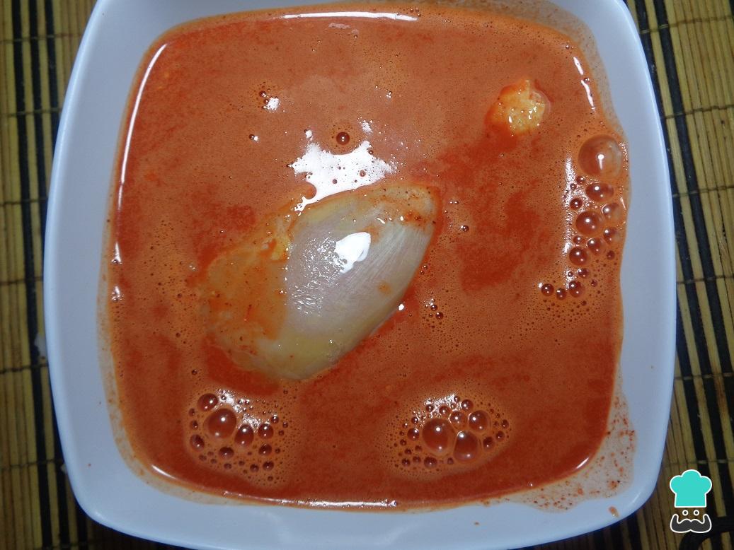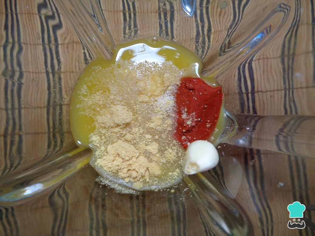 Coloque em um liquidificador o suco de laranja, a pasta de colorau, o alho, o caldo de galinha em pó e uma pitada de sal. Misture bem, até obter um molho homogêneo.