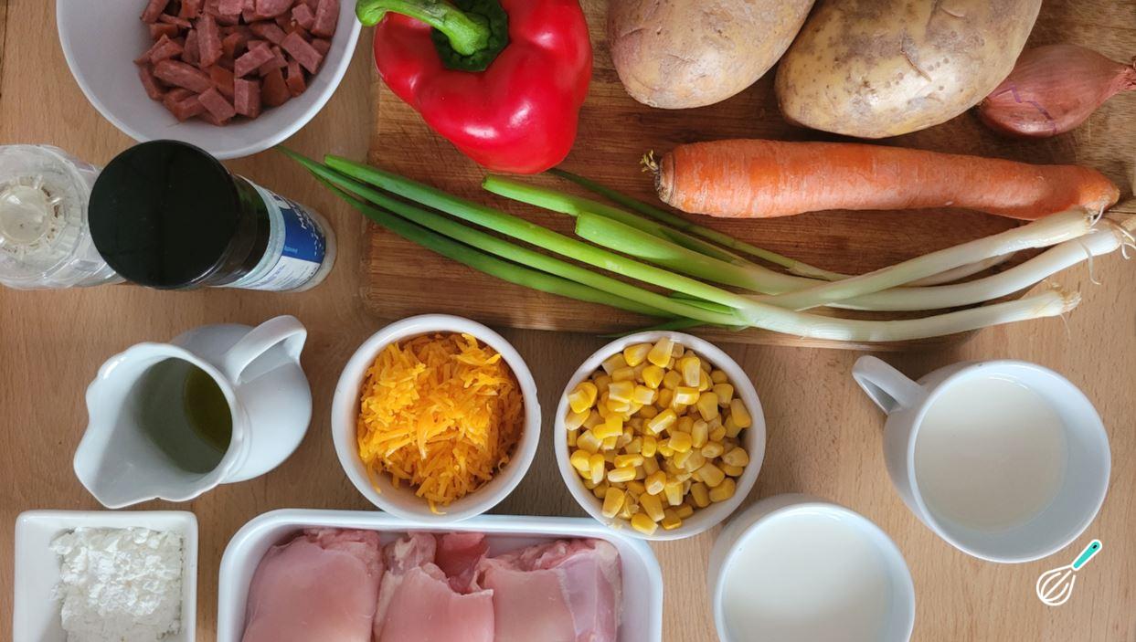 Separe os ingredientes para fazer seu frango com creme de batata e bacon.