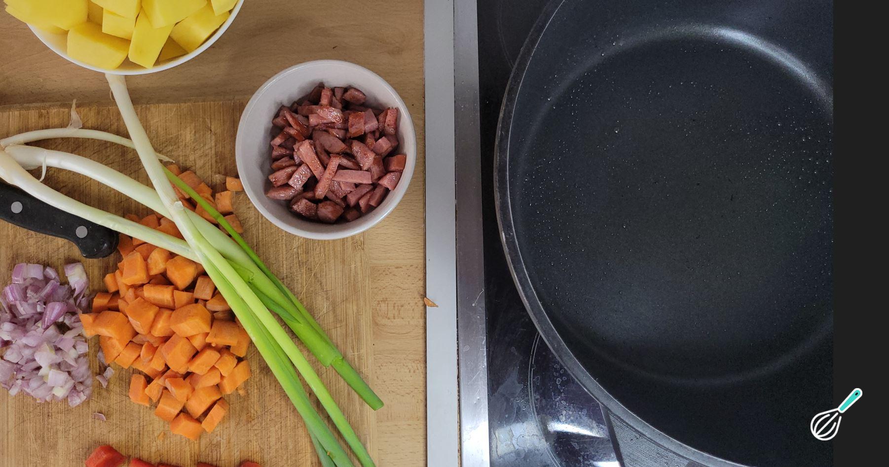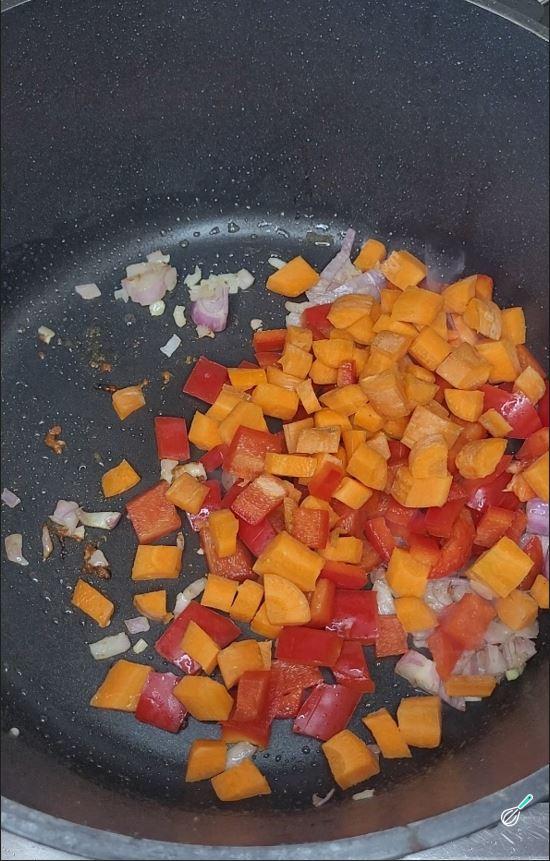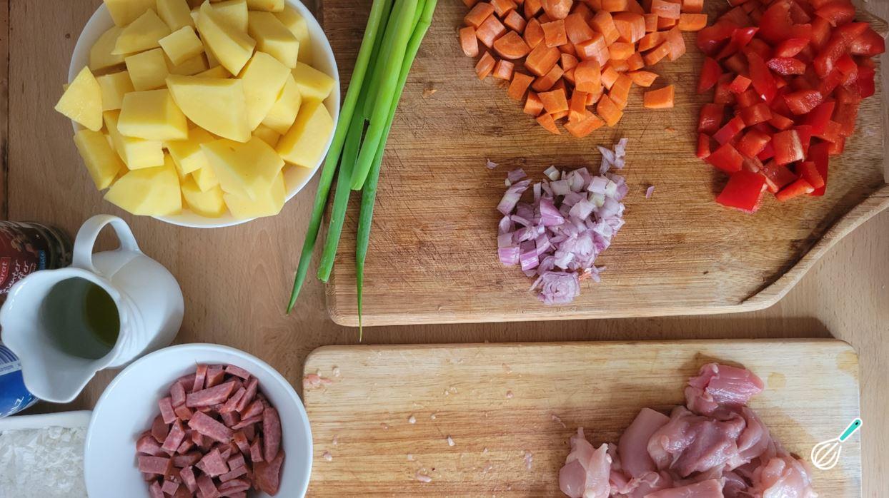 Corte as sobrecoxas em cubos, as cenouras e os pimentões em cubos médios. Descasque e corte as batatas em cubos pequenos.