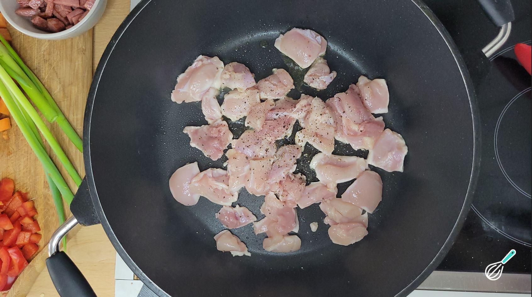 Na mesma panela, coloque um pouco de azeite e adicione os cubos de frango. Tempere com sal e pimenta do reino, deixe dourar bem dos dois lados e reserve