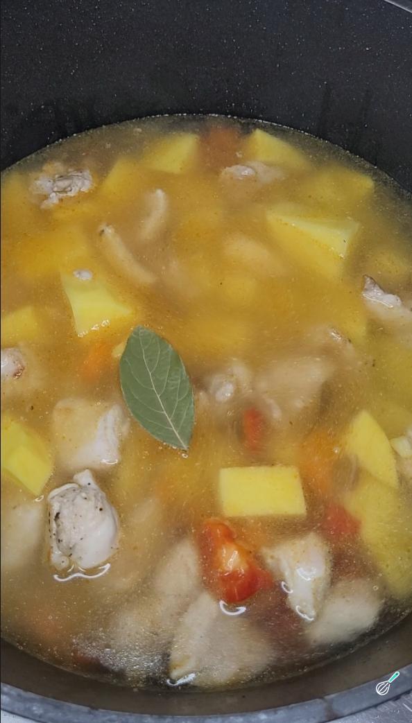 Adicione a batata e volte com o frango. Cubra com água, adicione uma folha de louro e deixe cozinhar até que as batatas estejam macias.