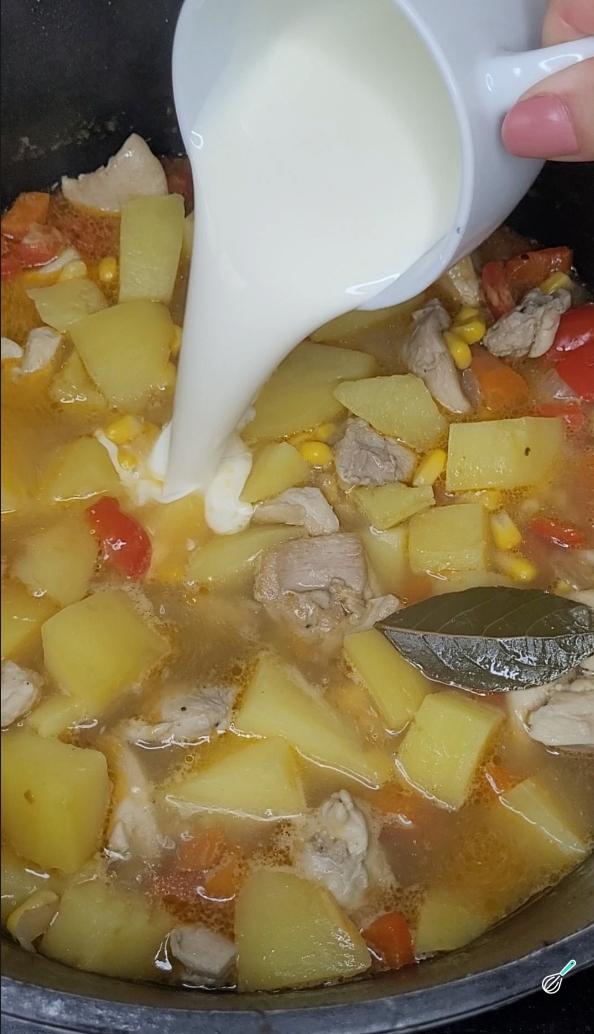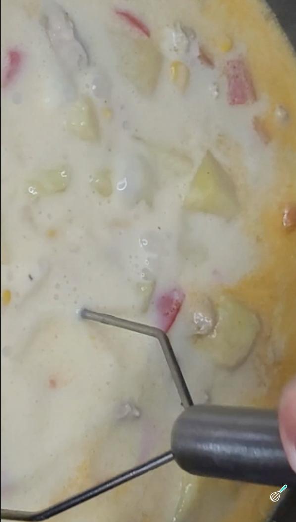 Misture o leite com o amido de milho e mexa bem para dissolver o amido. Quando as batatas estiverem macias, adicione o milho, a mistura de leite + amido, o creme de leite e o queijo.