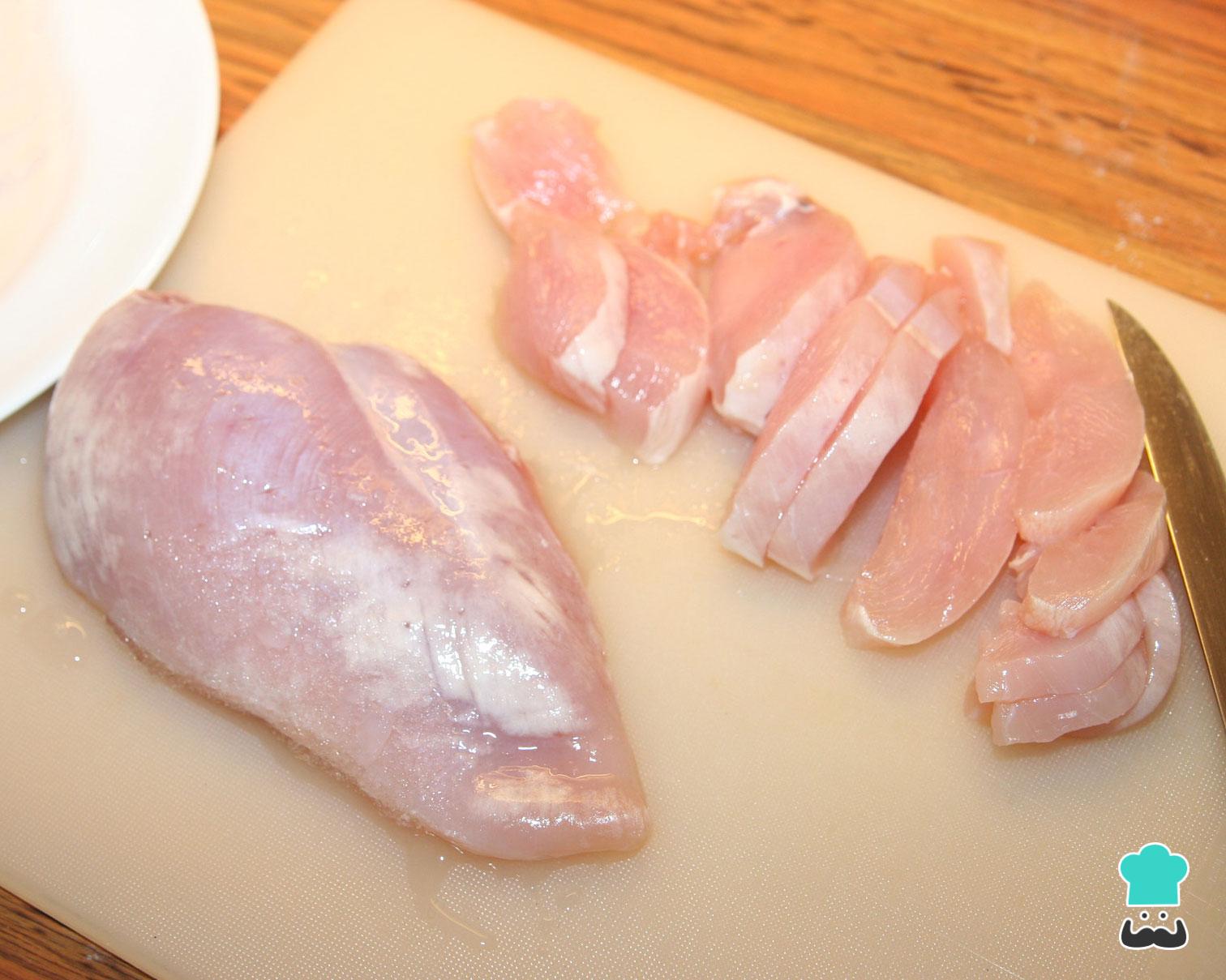 Primeiramente corte o peito de frango em filés ou tirinhas e tempere com sal e pimenta a gosto. Se você quiser pode usar outros ingredientes para temperar o frango: suco de limão, alho, páprica, orégano, etc. Confira nossas dicas de como temperar peito de frango e como temperar filé de frango.