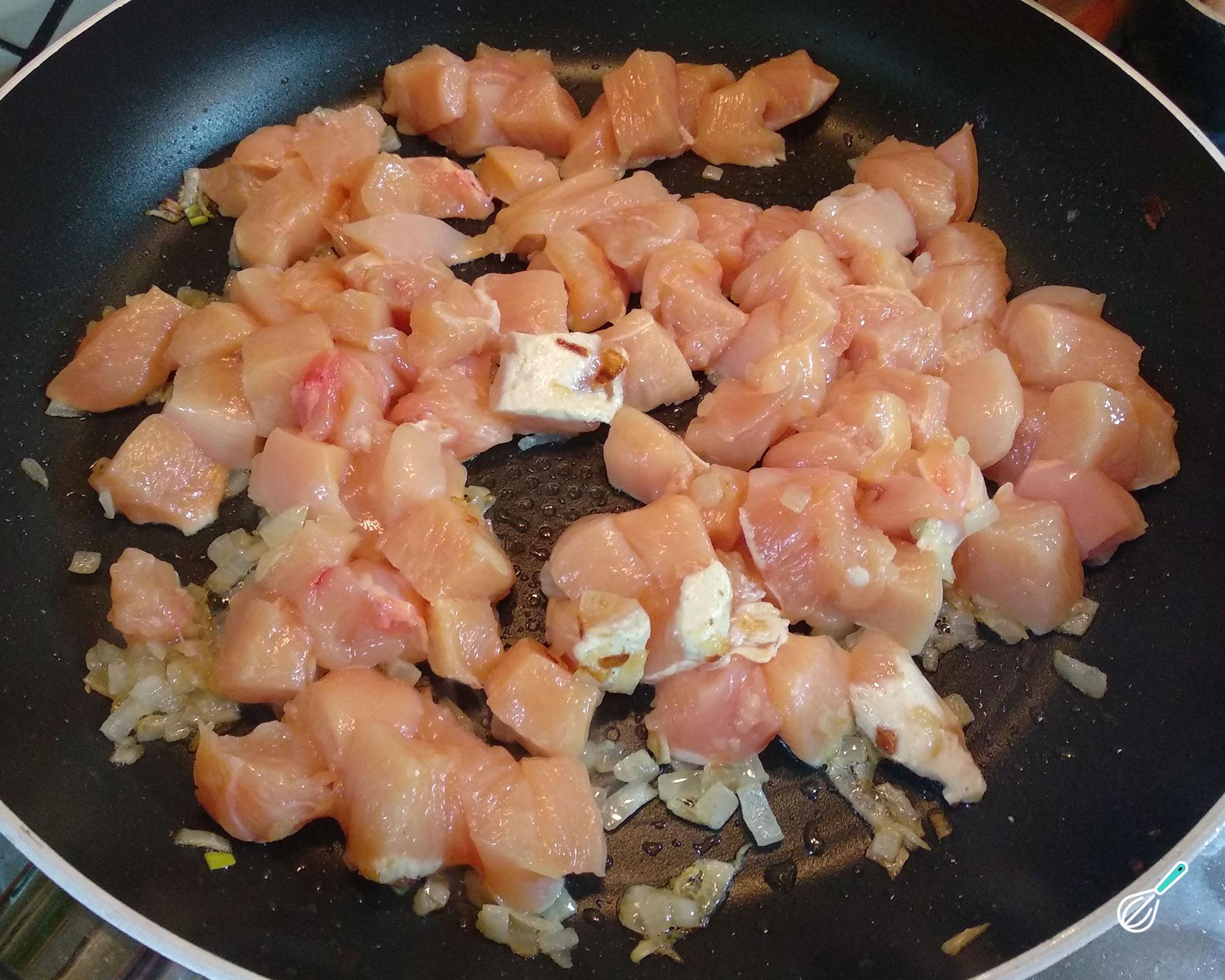 Após dourar os amendoins retire-os para um recipiente e mantenha o azeite na frigideira. Adicione meia cebola bem picadinha e deixe dourar. Depois coloque o frango, tempere com sal e pimenta, e deixe cozinhar por 10-15 minutos e desligue.