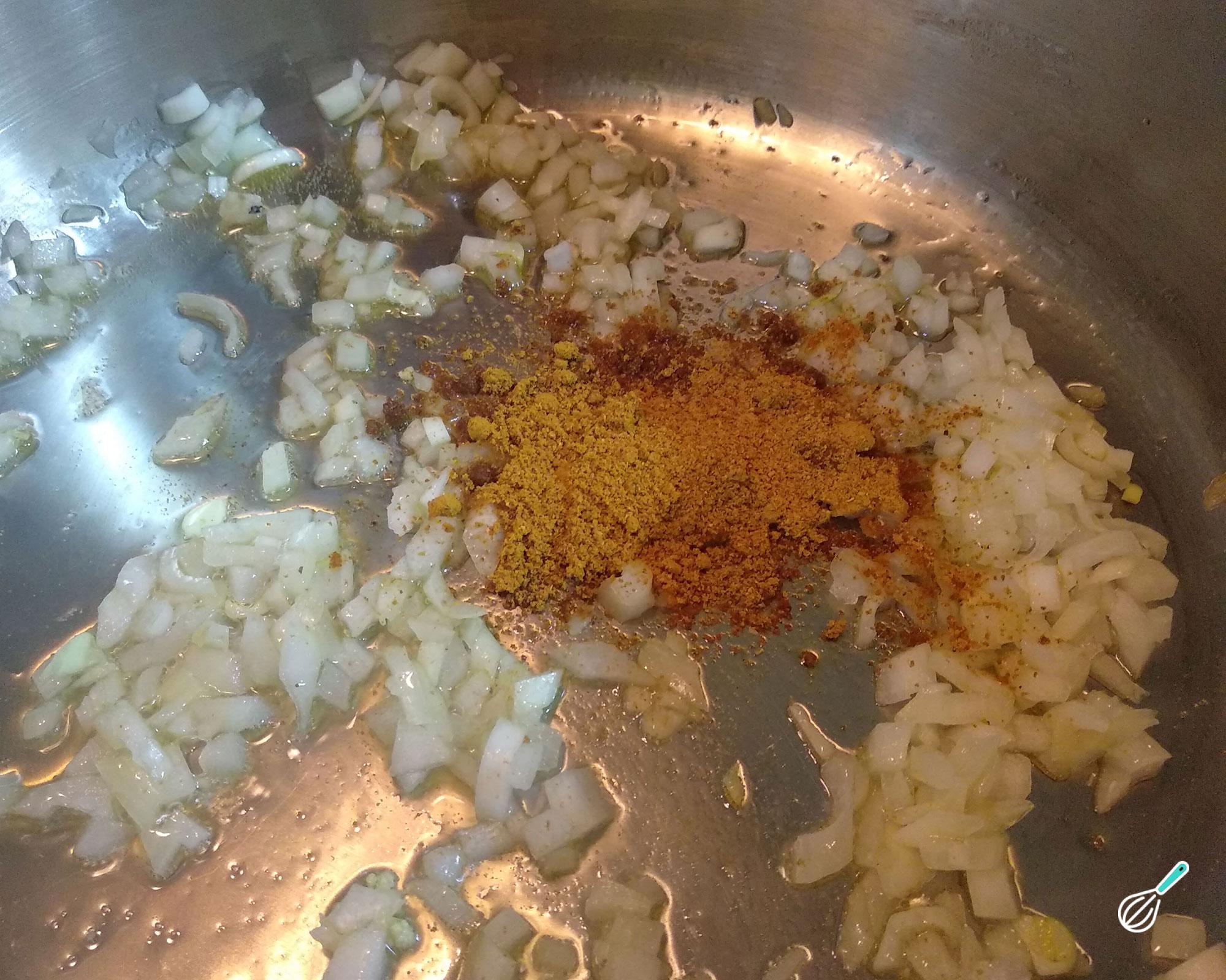 Enquanto isso leve também ao fogo médio uma panela com um fio de azeite. Refogue aí a restante cebola picada e, quando estiver macia, coloque o curry. Misture até virar uma pasta.