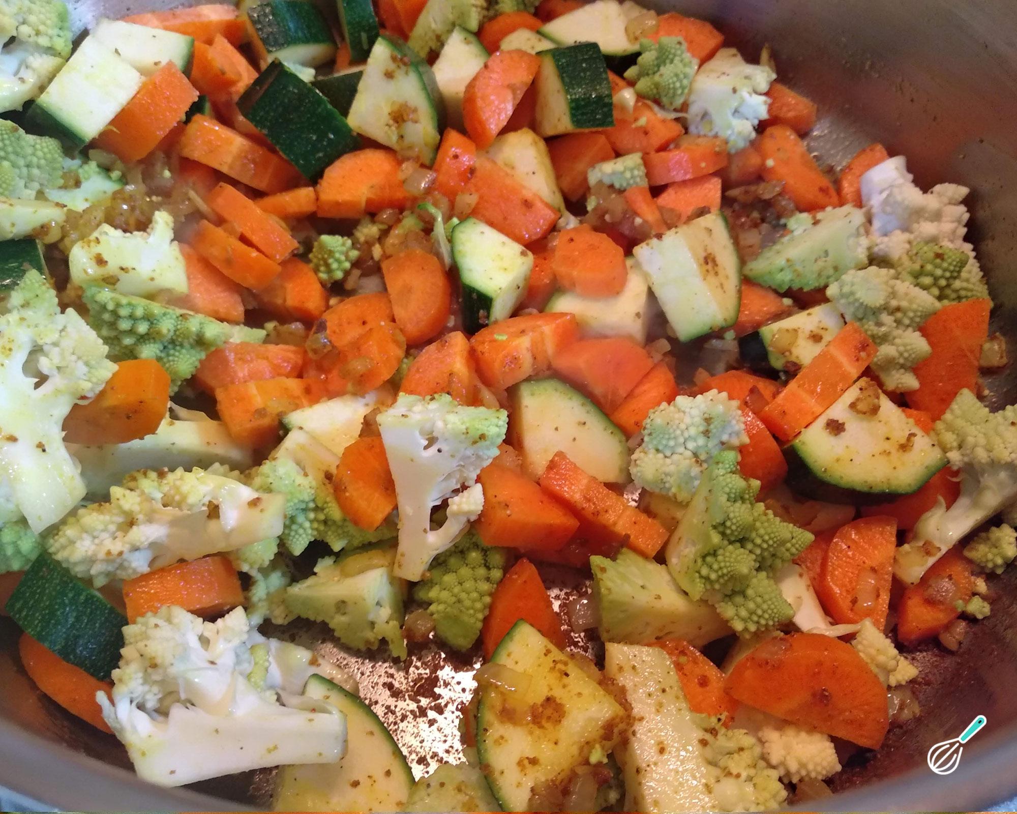 Em seguida adicione os legumes picados na panela: a cenoura, a abobrinha e a couve-brócoli romanesco ou brócoli comum. Mexa e adicione o leite de coco. Deixe cozinhar tampado por 15 minutos ou até os legumes estarem macios.