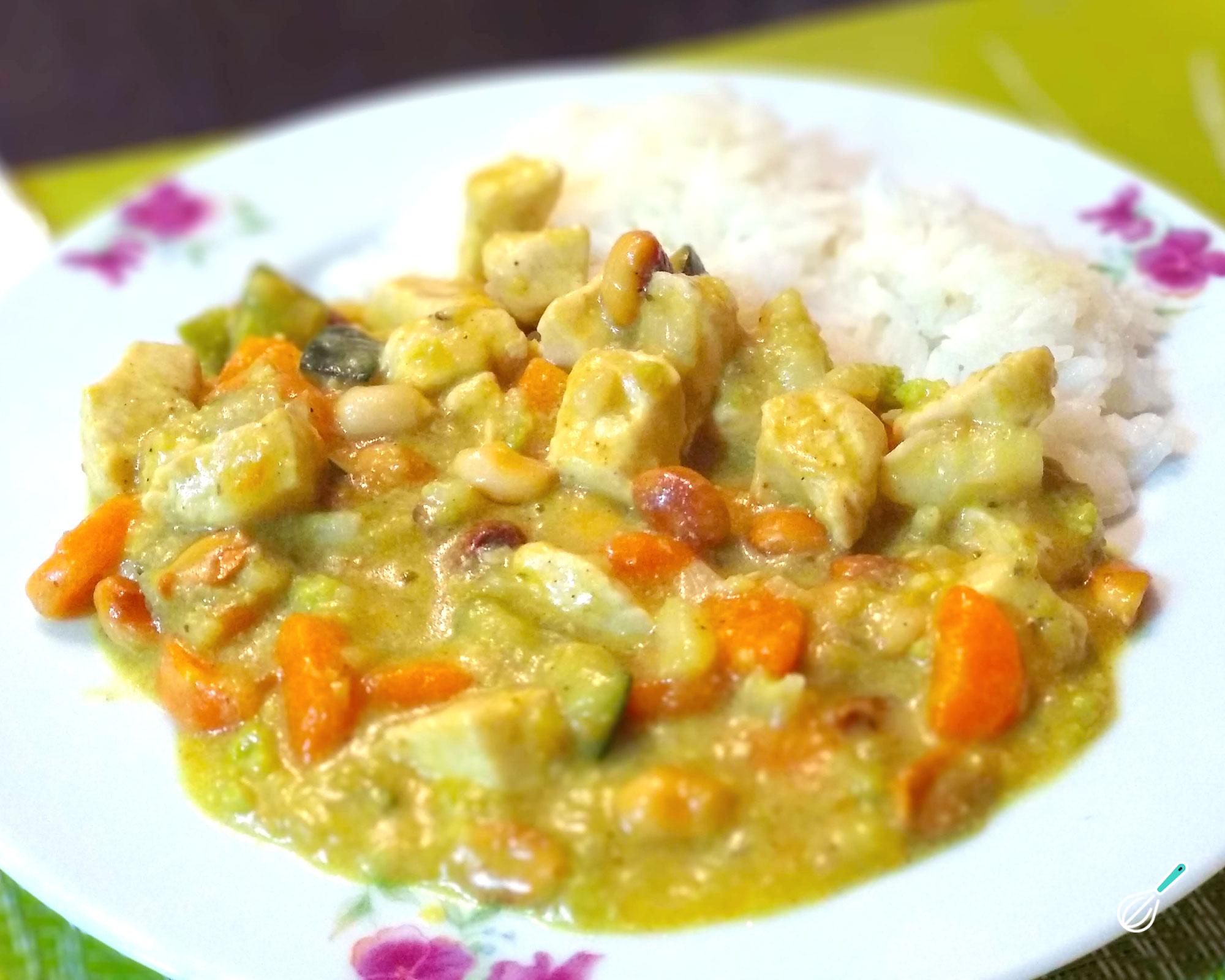 Depois do passo anterior adicione o frango e o amendoim na panela dos legumes e misture tudo. Está pronto seu frango ao molho curry com leite de coco! Sirva acompanhado com arroz basmati e bom apetite!