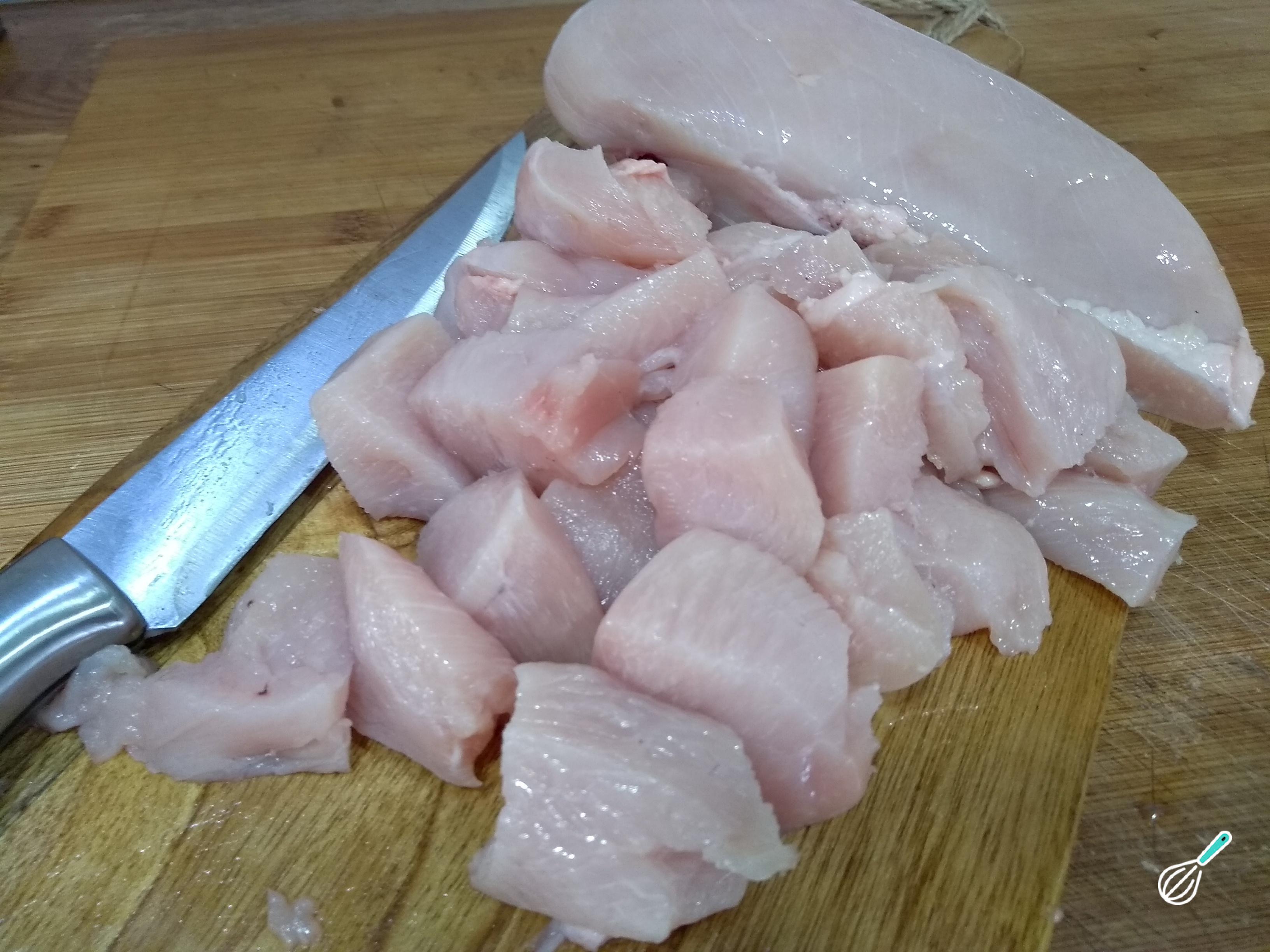 Pique os peitos de frango em cubinhos, tentando que fiquem todos com mais ou menos o mesmo tamanho.