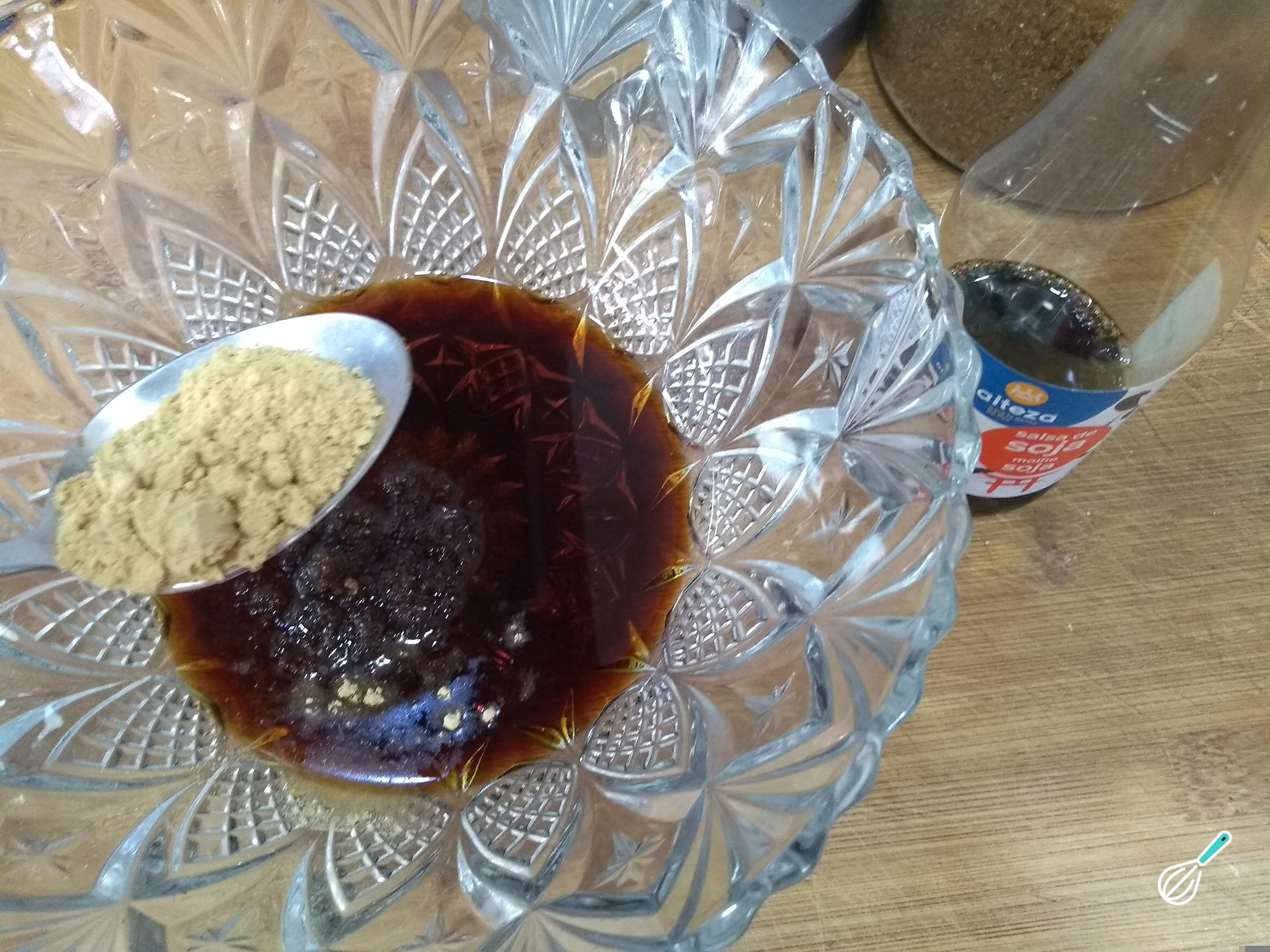 Prepare o molho agridoce dissolvendo o açúcar no shoyu. Neste caso preparei meu frango agridoce com açúcar mascavo, que é considerado mais saudável que o açúcar branco. Se você cuidar da sua alimentação, prefira também usar um shoyu sem açúcar e baixo em sódio.