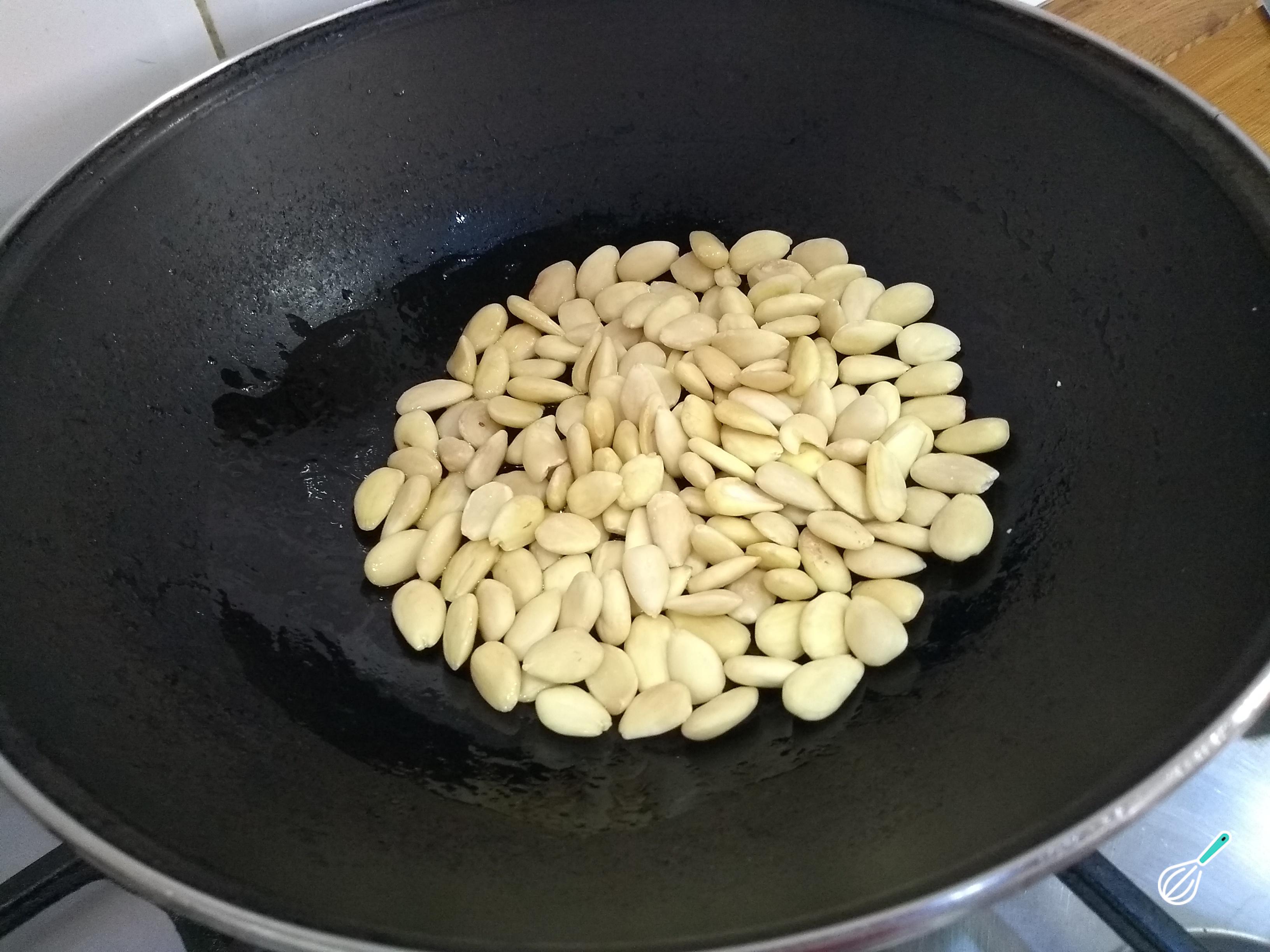 Após esse tempo, doure as amêndoas numa frigideira, de preferência tipo wok. Para isso coloque um fio de óleo na frigideira, adicione as amêndoas e leve ao fogo alto. Fique mexendo até que as amêndoas libertem seu aroma e doure. Depois retire-as do fogo e reserve.
