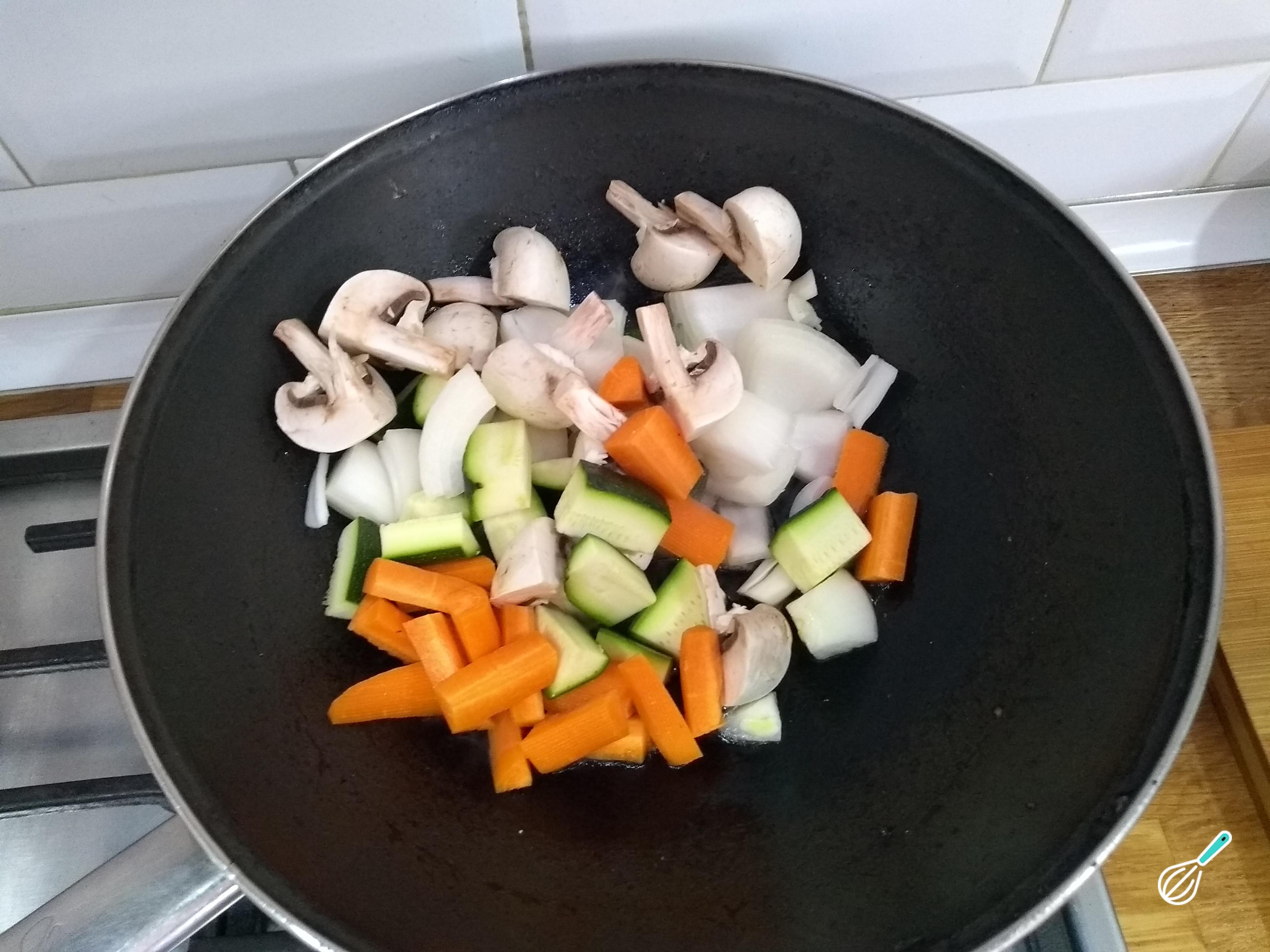 Na mesma frigideira coloque os legumes picados: a abobrinha, a cebola, a cenoura e os champignon. Refogue no fogo médio durante 3 minutos ou até estarem levemente cozinhados, mas ainda crocantes. Retire para um prato.
