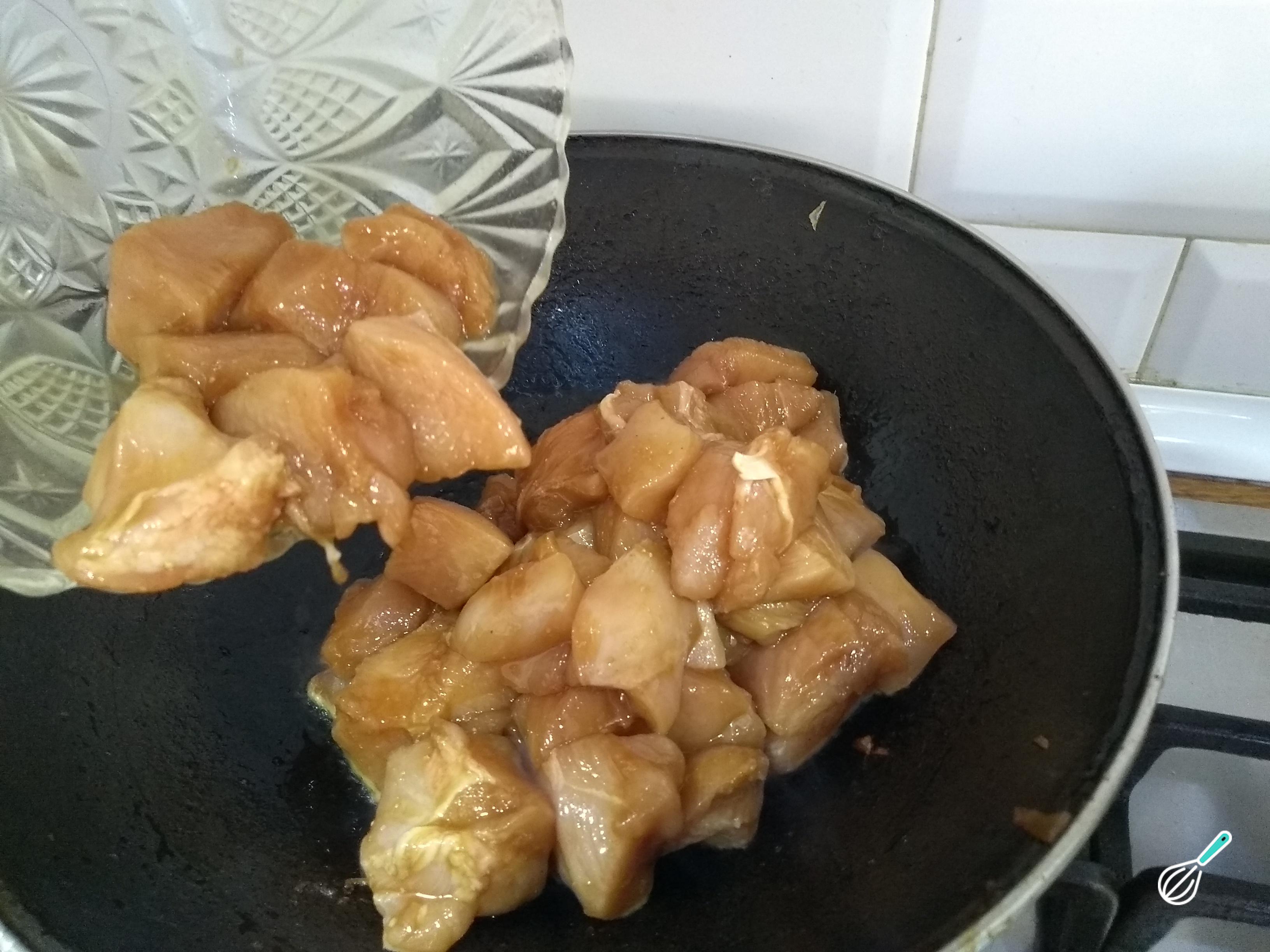 Se necessário, coloque mais um fio de óleo na frigideira e cozinhe agora o frango com o seu líquido do marinado. Suba o fogo e salteie o frango durante cerca de 7 minutos, mexendo de vez em quando, ou até perceber que está pronto.