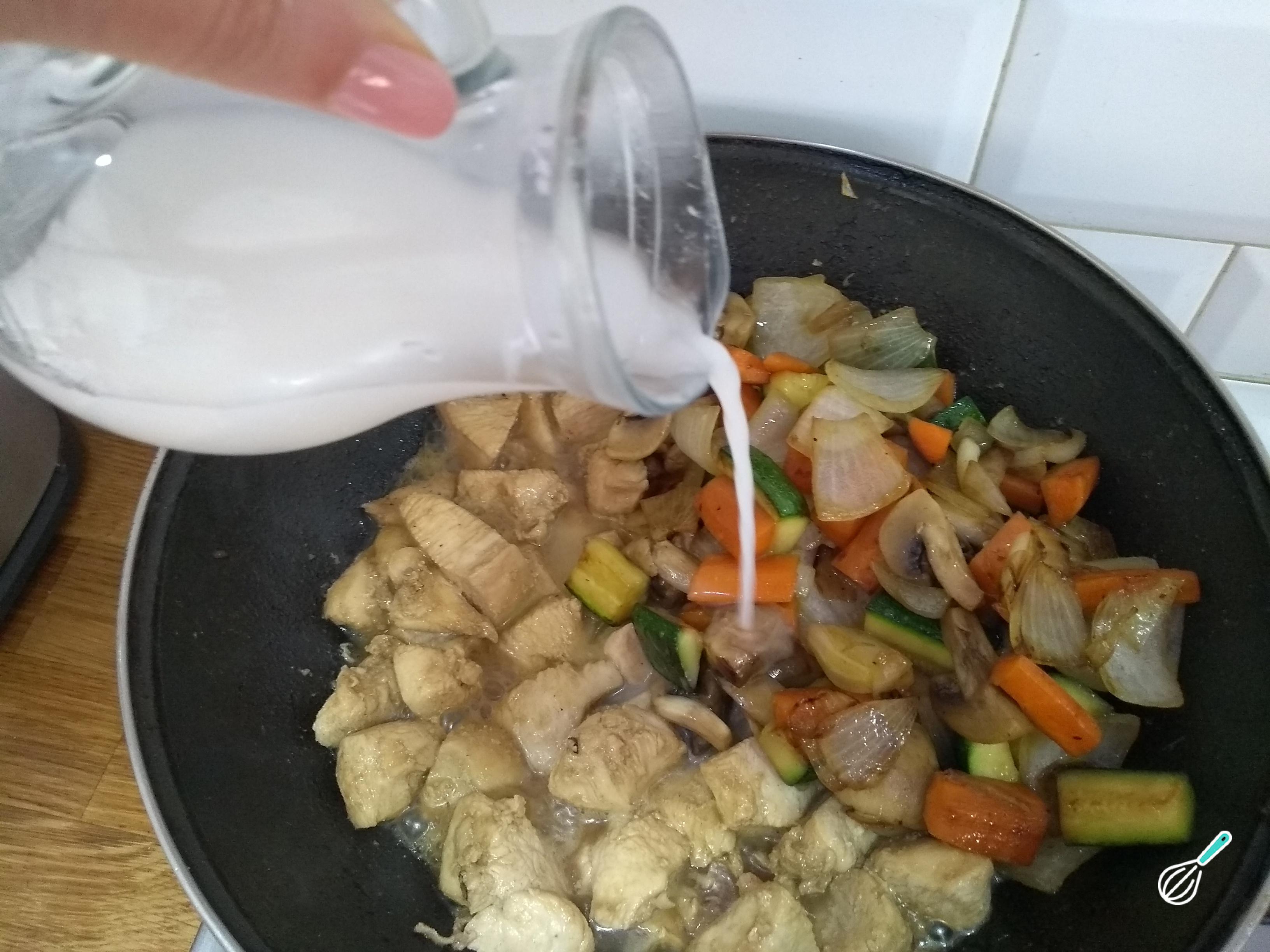 Volte com os legumes na frigideira e, à parte, dissolva o amido de milho na água em temperatura ambiente. Adicione essa água na frigideira, misture tudo e deixe cozinhar por 10 minutos no fogo médio. No fim desse tempo o seu frango agridoce deverá estar cremoso e os legumes deverão estar tenros (não desmanchando).