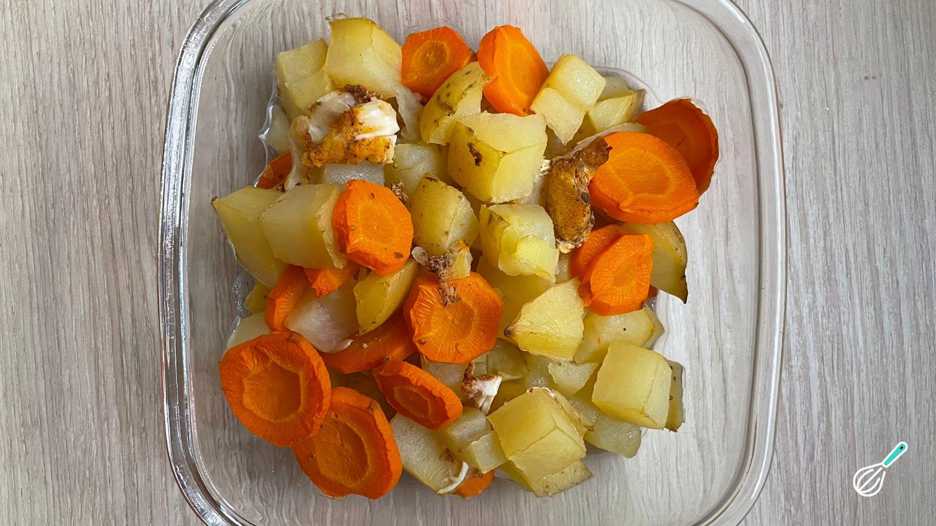 Comece cozinhando previamente a batata e a cenoura até que fique al-dente. Coloque em uma travessa e tempere com sal, pimenta e azeite.