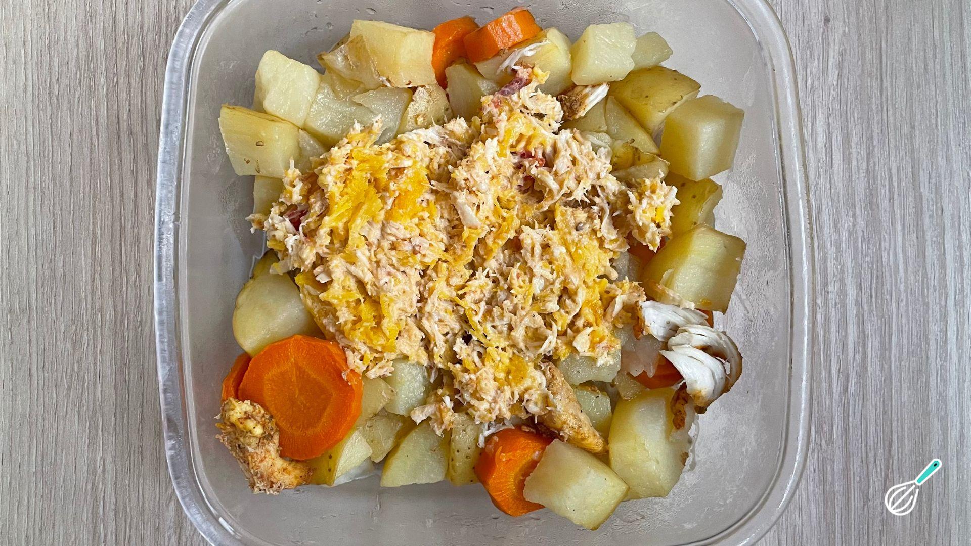 Que tal uma receita de frango no forno diferente? Feito com frango desfiado, essa receita é perfeita para os dias que temos poucos ingredientes na geladeira! Com batata e cenoura, esse frango com legumes pode ser complementado com outros ingredientes e temperos. Use a criatividade para deixar seu prato ainda mais gostoso!