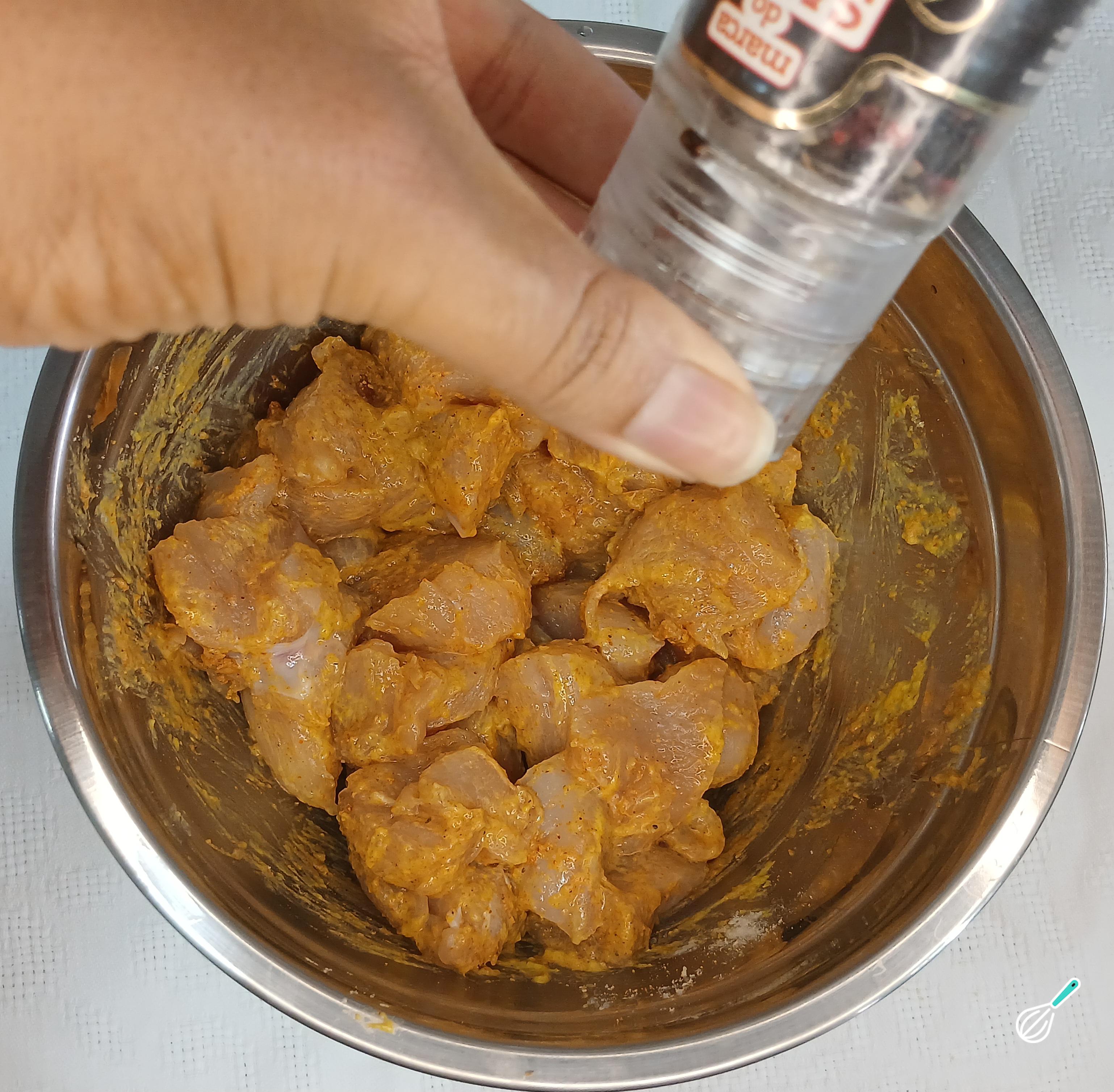Feito isso, corte o filé de peito de frango em cubos pequenos. Em um bowl coloque o frango e acrescente os temperos de sua preferência, sal e mostarda. Misture tudo muito bem com as mãos para que o frango absorva bem os temperos.