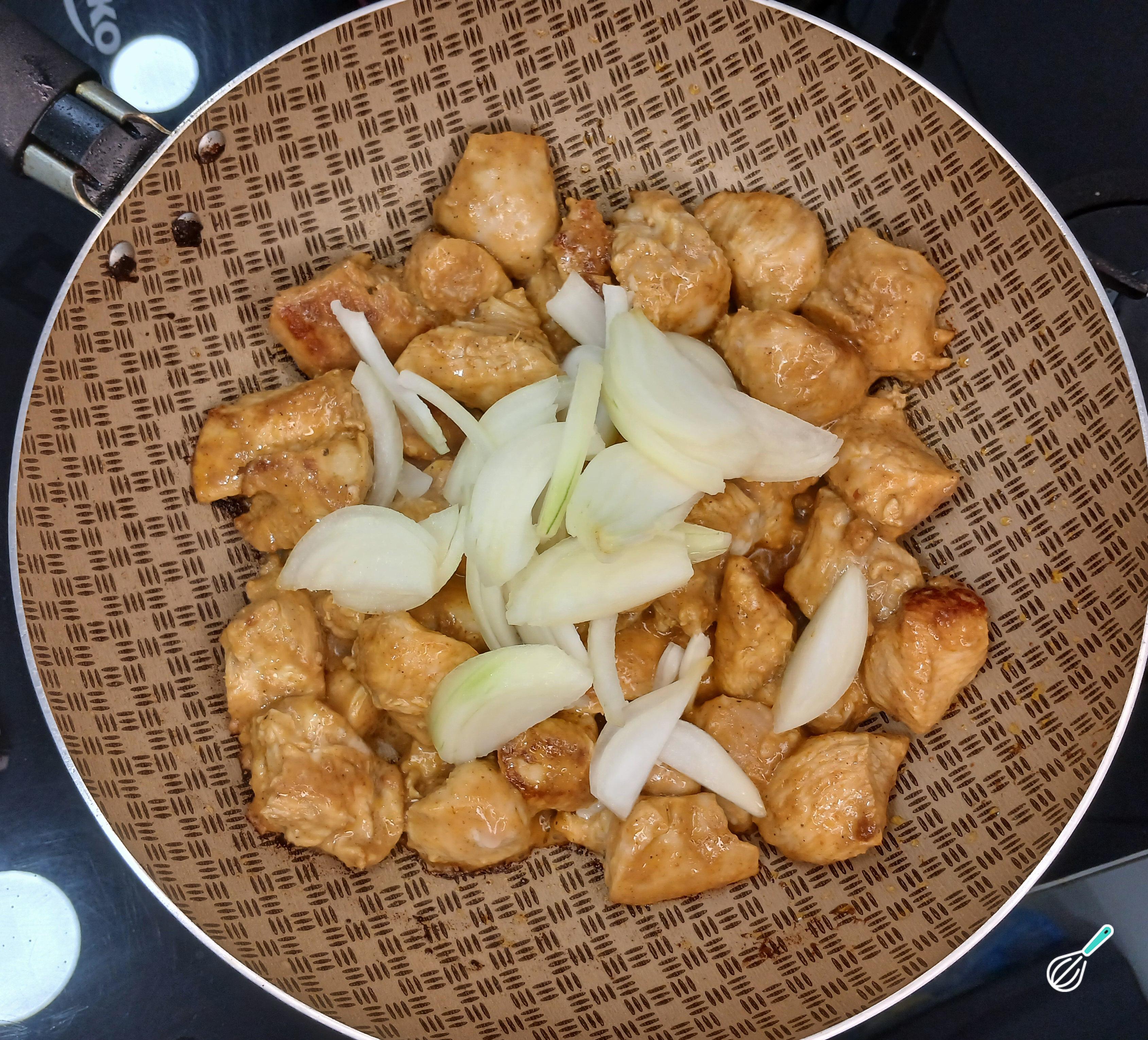 Em uma panela, coloque o óleo de soja. Acrescente o frango e doure ele dos dois lados. Em seguida acrescente a cebola e deixe refogar. Mexa bem para incorporar os sabores e a cebola soltar líquido.
