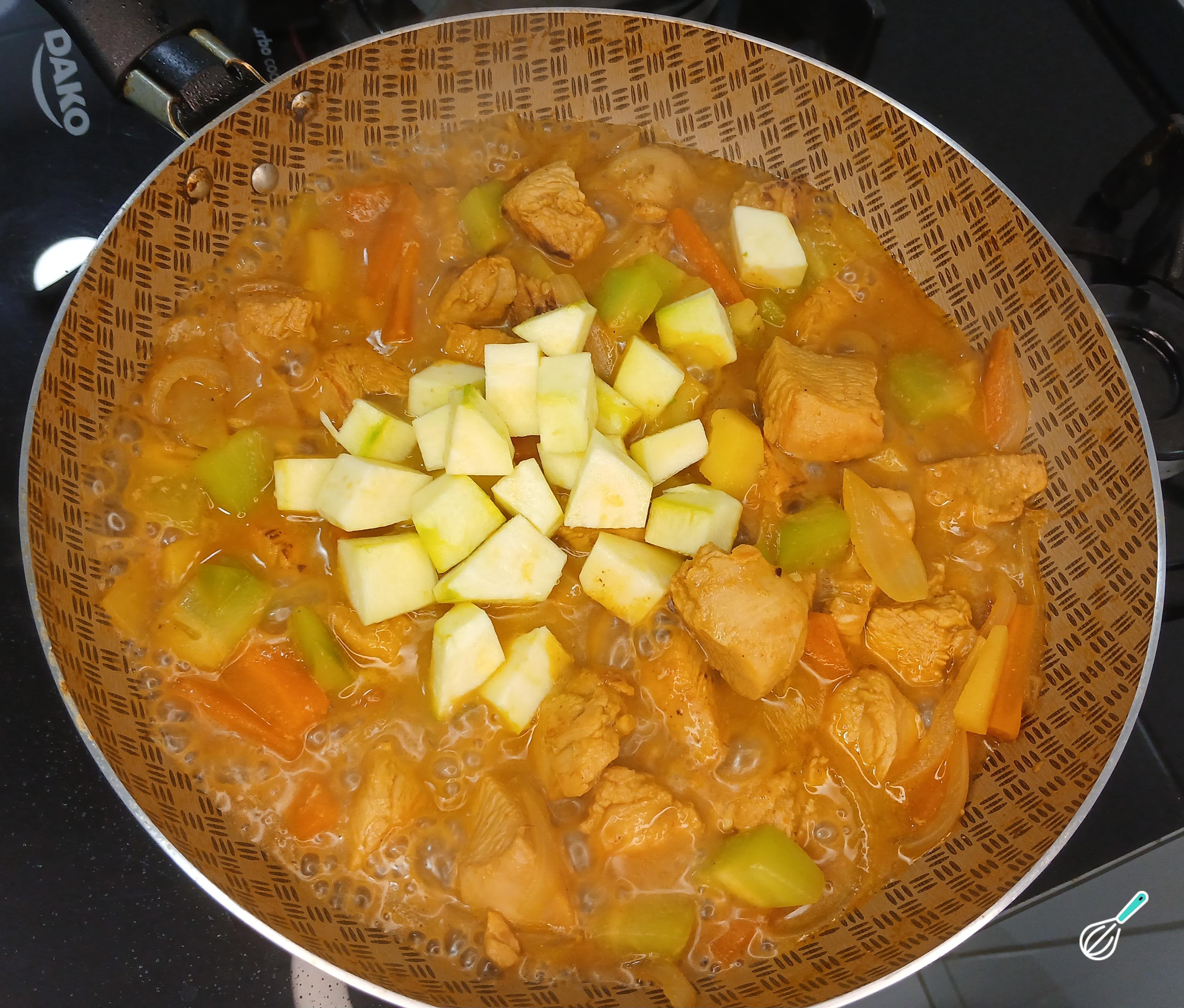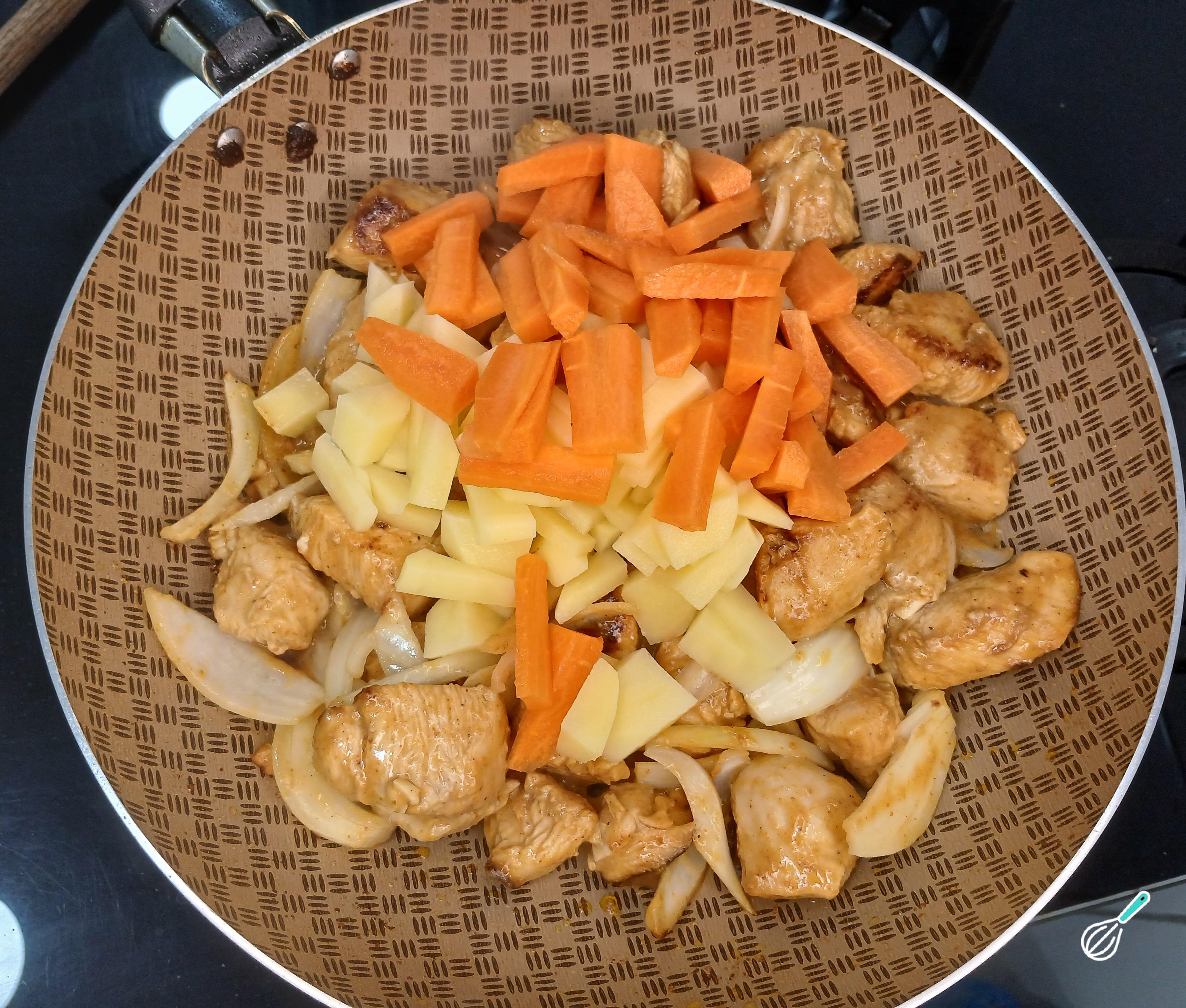 Depois de refogar o frango e a cebola, acrescente a cenoura e a batata asterix deixe que refogue um pouco. Em seguida adicione água aos poucos. Vá colocando água e deixando cozinhar. A medida que a água for secando adicione mais um pouco e verifique o cozimento do frango.