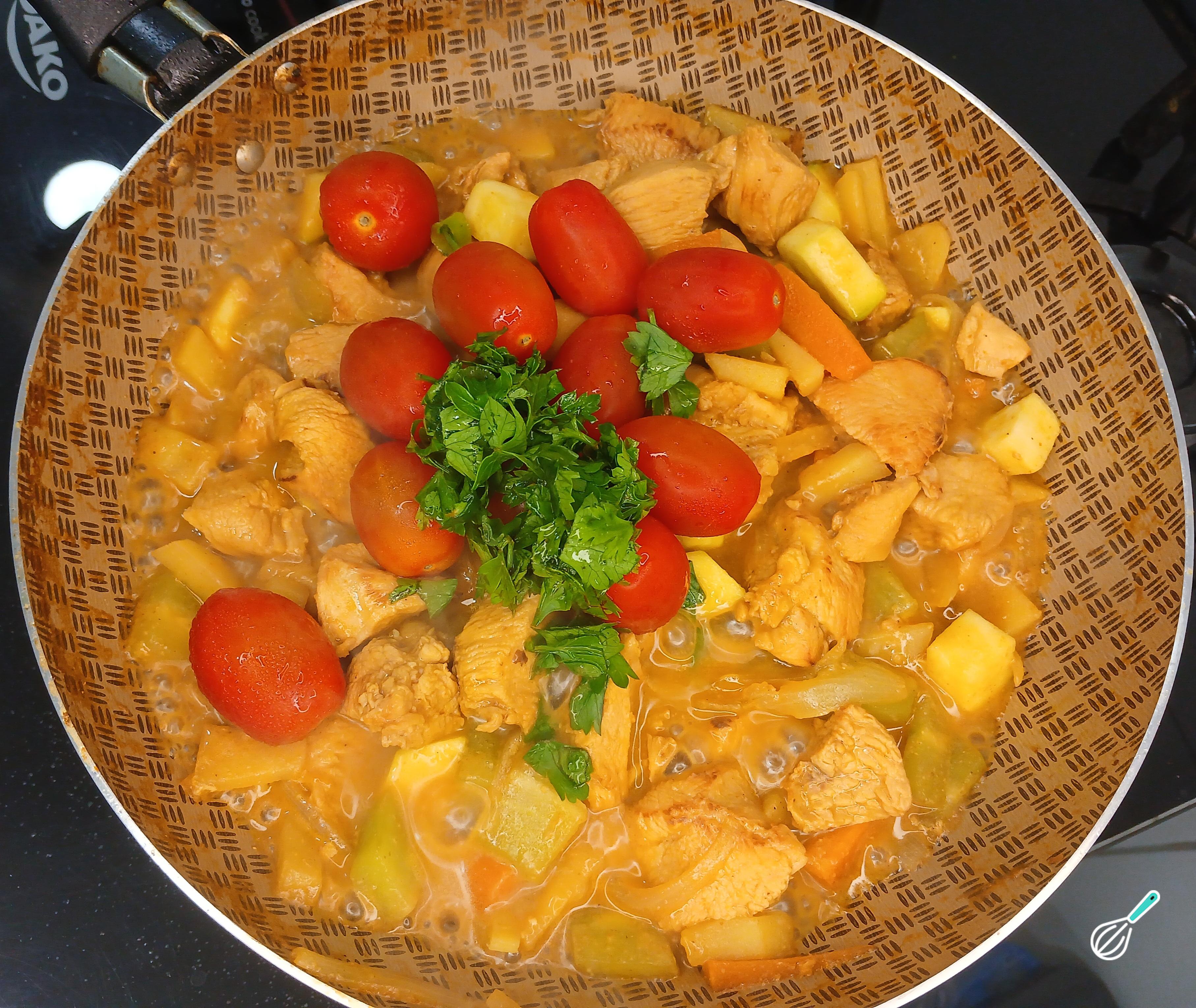 Quando o frango estiver cozido, acrescente os tomates cerejas inteiros e a cebolinha verde e salsinha. Nesta etapa prove e acerte o sal e pimenta se for necessário. Deixe cozinhar e desligue o fogo. Mexa para incorporar os sabores.