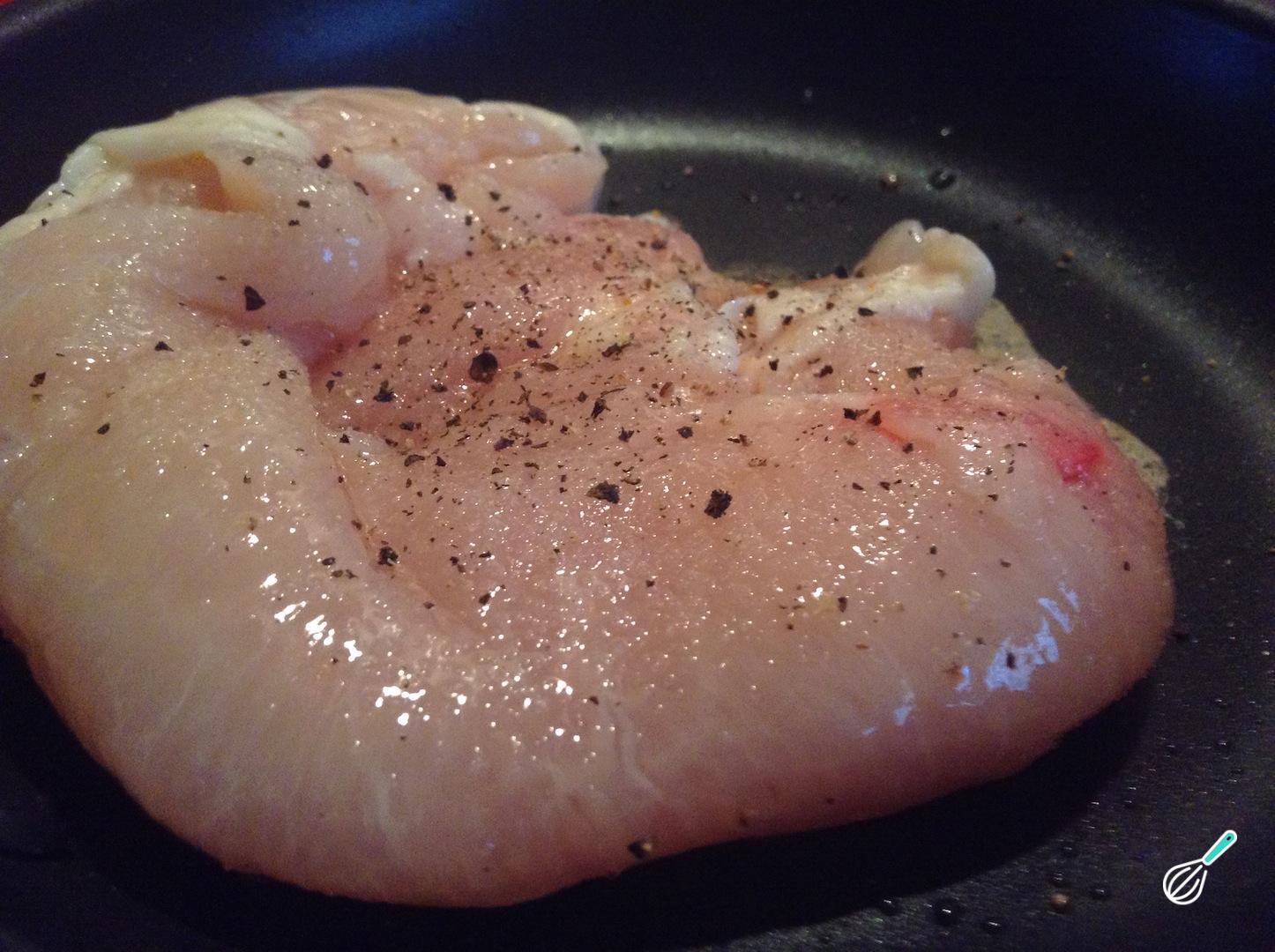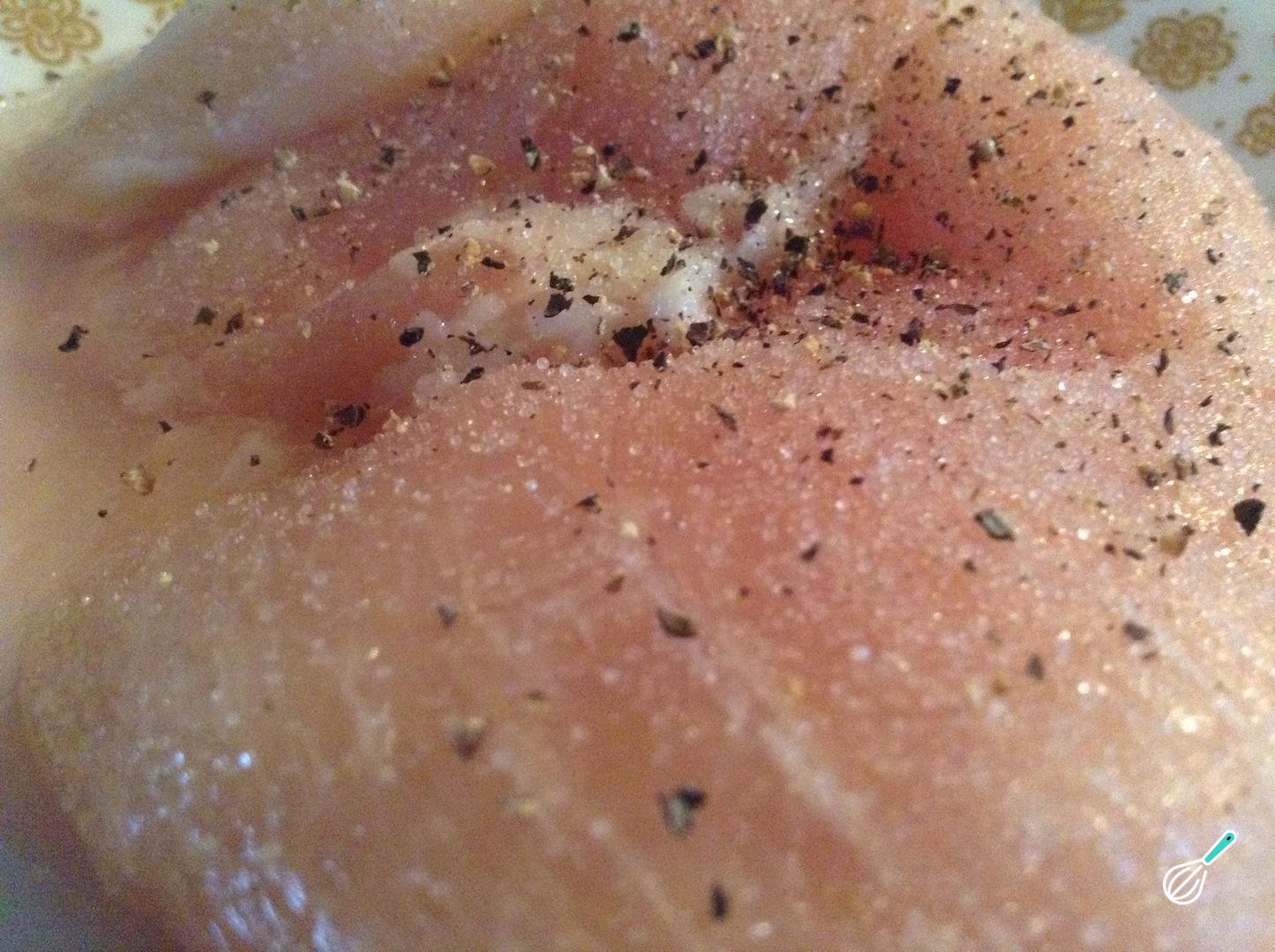 Para começar a preparar seu frango com maionese, você deve temperar o frango com um pouco de sal e pimenta.