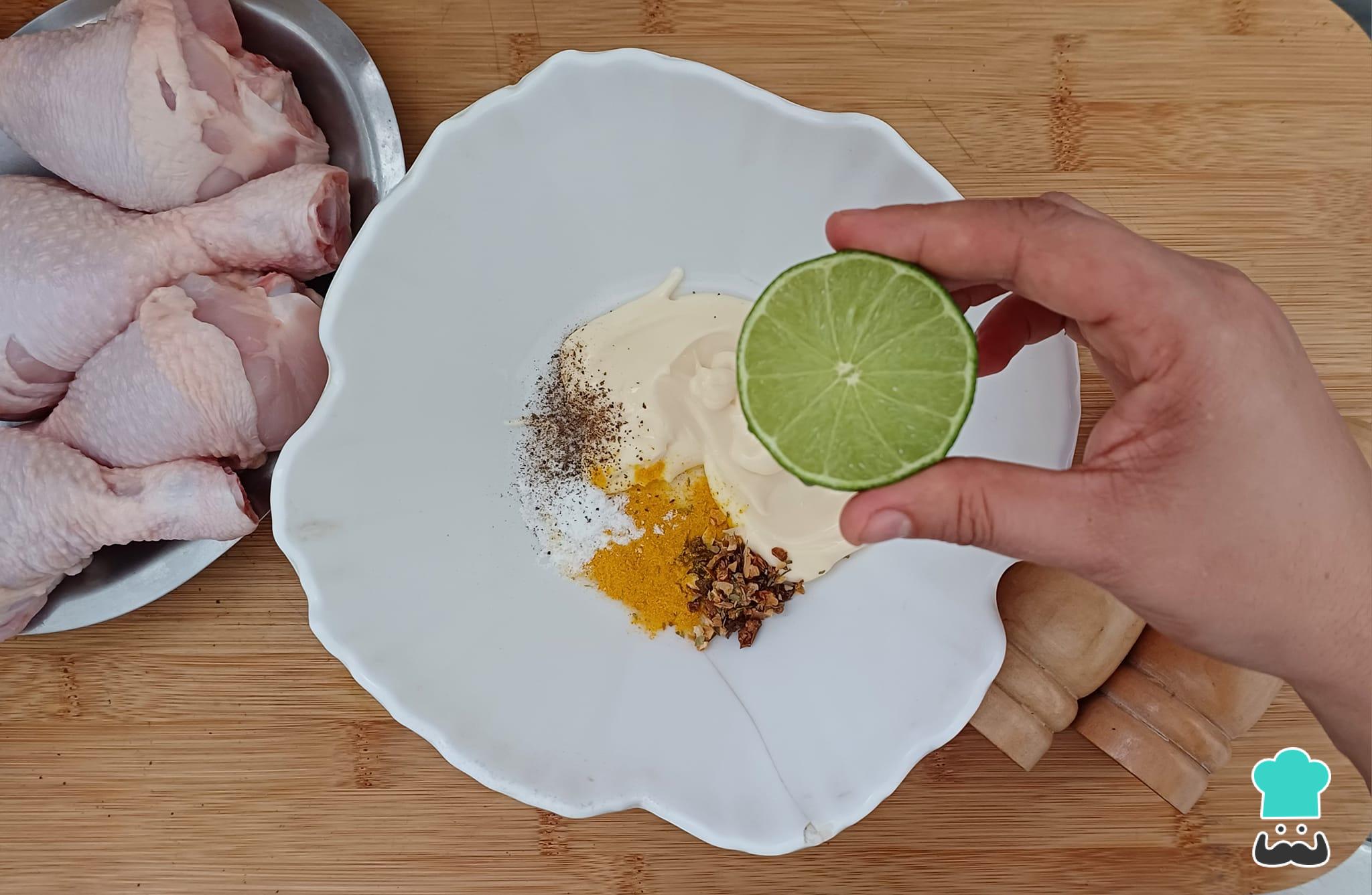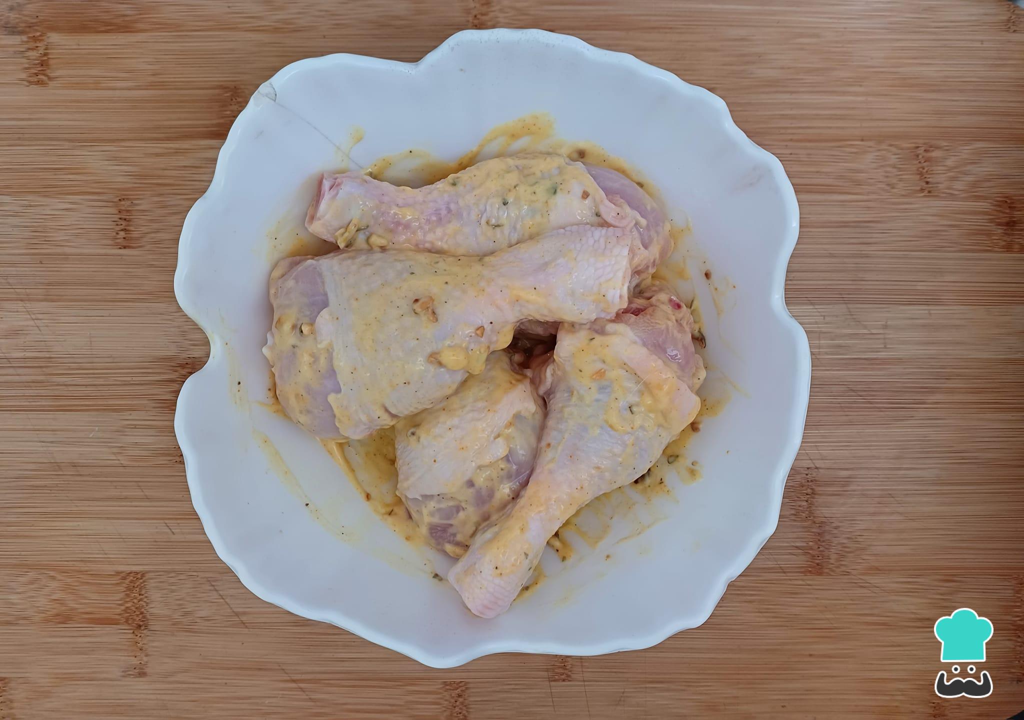 Besunte as coxas de frango neste tempero e deixe marinando por 30 minutos ou mais até que o frango absorva o sabor.