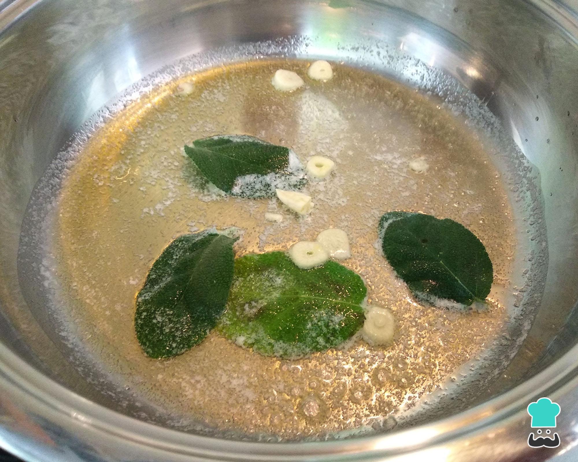 Leve ao fogo baixo uma frigideira com os ingredientes do molho de sálvia: a manteiga, o azeite, a sálvia e o dente de alho picado. Deixe por 5 minutos ou até as folhinhas de sálvia começarem a ficar crocantes.
