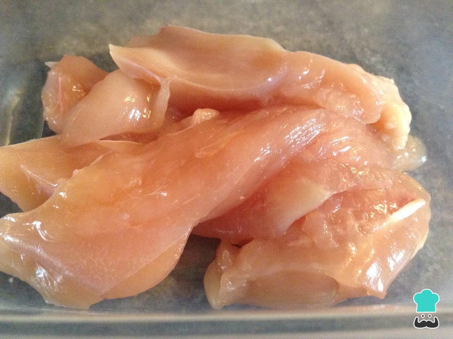 Corte o peito de frango em tiras grossas como mostrado na foto e coloque-o em uma tigela. Regue o frango com a marinada do passo anterior e coloque-o na geladeira por 30 minutos a 1 hora. Quanto mais tempo deixar o frango na marinada, mais saboroso ele ficará.