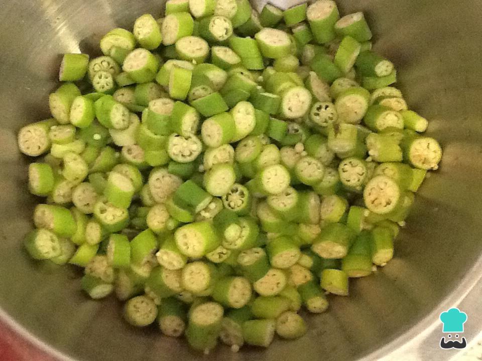 Cozinhe o quiabo, mexendo de vez em quando sem desmanchar, até que solte toda a baba (demorará cerca de 20 minutos). Para ajudar acrescente algumas gotas de limão. Desligue e reserve o quiabo.